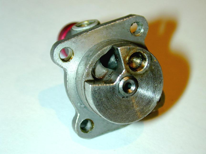 The backplate is relatively conventional with an aluminium timing rotor, held captive under a steel retainer. This retainer is secured by an external screw as shown in the picture here. The inlet is positioned at 12 o'clock, requiring a channel to be provided, following in the direction of rotation, to extend the induction period. I discovered this trick while making the RRV AHC with inlet in the same location. It is not possible to totally govern the inlet duration with the cut-out in the rotor, as the required position would intersect the driving pin position. The relieved backplate trick side-steps that. Note that the backplate is fitted with an anodized venturi insert. The engine reviewed by Herbert was provided with two: 5.0mm, and 3.5mm. Alas, mine came only with the 5.0mm insert. You can also see more numbers stamped under the rotor pin screw. On my engine, this is "539" with the "3" about twice the height of the other two digits. With no evidence whatsoever, I'm going to assert this means the engine was assembled in the March run of 1959. Prove me wrong .
