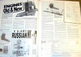 So digging further back to the Aeromodeller of November 1973, we again find Peter Chinn describing an old friend, but closer examination shows not a Mk 17, but the predecessor Mk 16K [3]. Here he again attributes the design to V Petukov, giving 1954 as the year and saying the Mk 16 is "..quite the best Soviet engine of its type that we've seen.". The photos show an engine almost identical to the later Mk 17 with a few less obvious external differences. There is no venturi insert and the rotor pin is permanently rivited to the backplate. The raised lettering on the crankcase journal says "MK-16" (naturally), and is on the right hand side of the case. Finally, the cooling fins have two curions scallops cut on either side of the front cylinder attachment screw. This feature is not symetrical--there is no such relief cut between the rear screws. Internally, the engine appears the same except for the oil grooves cut into the piston. Measurement would disclose many differences though. Although the bore and stroke are the same, the Mk 16K (known simply as the Mk 16) weighed in at 113 grammes compared to 131 measured by Chinn for the Mk 17 (and 130 as measured by me). The power output was quoted (though not tested) as 0.14 bhp at 14,000 rpm, the same as later claimed for the Mk 17, so the 16 would have the edge in the power to weight stakes.