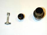 The remaining parts are shown here. The cooling fins are conventional, anodized aluminium, but in another touch that screams attention to detail, the compression screw does not thread into the head. Rather, the head carries a plated steel insert, "castelated" to exert some pressure (adjustable) on the screw thread. Although apparently pressed in place, a flange on the bottom of the insert will ensure it stays in place. The spinner nut and washer are also anodized to match. Now look at the screws: three long ones for the head and four short ones for the backplate. The screw holes in the cooling fins clear the screw heads all the way down to the last, thick fin. This is nice. The head screws need only be short and so less prone to suffer from torquing them up. The backplate screws (same thread) are unusual for their lengths; no two are the same! They have not been cut, that's just the way they are.