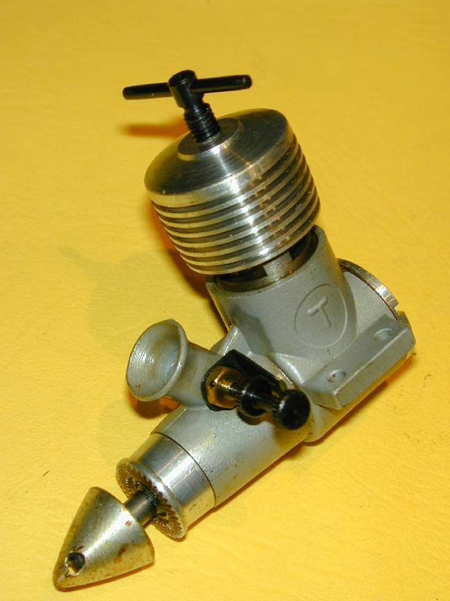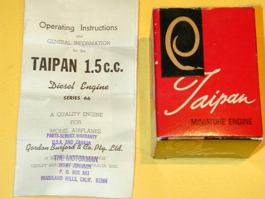 The Series 66 Taipan 1.5 Diesel is a totally delightfull example of Gordon Burford's engines and to my mind, represents the pinacle of his development program. It is a powerfull, easy starting engine with not a gram more weight than needed, yet rugged enough to withstand the rigours of a beginners attempts (both at starting, and learning to fly). It follows the well developed Taipan design philosophy: steel shaft with a splined prop-driver, riding in a cast iron bushing pressed into an aluminum die cast case fitted with a screw-in backplate. The hardened steel liner screws into the case and has three peripheral exhaust ports cut into a flange that seats the liner. Transfer ports are cut, angling up into the three posts between the exhaust ports giving exhaust/transfer overlap. Poston and contra-piston are cast iron; the con rod is aluminum and an aluminum cooling muff screws onto the liner. One departure from previous designs is the needle and spraybar assembly. Instead of a steel needle in a brass thimble, the Series 66 uses an externally threaded steel needle screwing into an internally threaded brass spraybar--maybe Gordon's haberdasher had at last run out of those #15 steel darning needles that he liked so much!