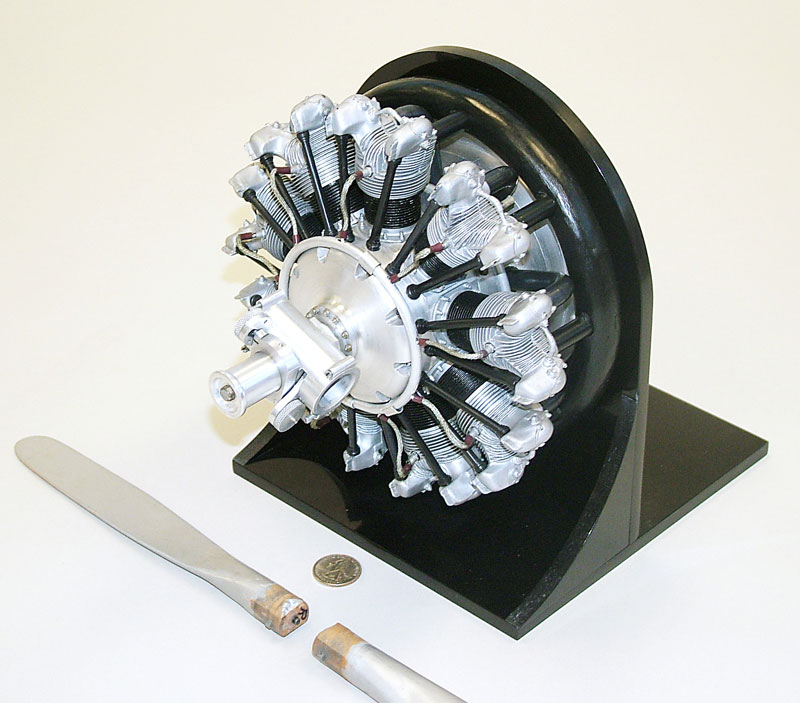Admittedly, there are a few minor problems (other than spending a year and a half building the engine!). True to scale, the engine doesn't like to start in the vertical position. The bottom cylinders will naturally flood, since they all feed from one master carburetor. Actually, this was typical of the full-scale radials, which would collect oil and fuel on the gravity side very quickly. It took a deft hand to get a 7- or 9-cylinder Wasp to run smoothly at all power settings, and it took a macho mechanic to keep the bottom plugs from fouling.
