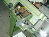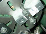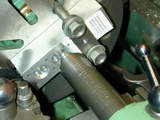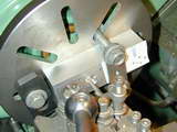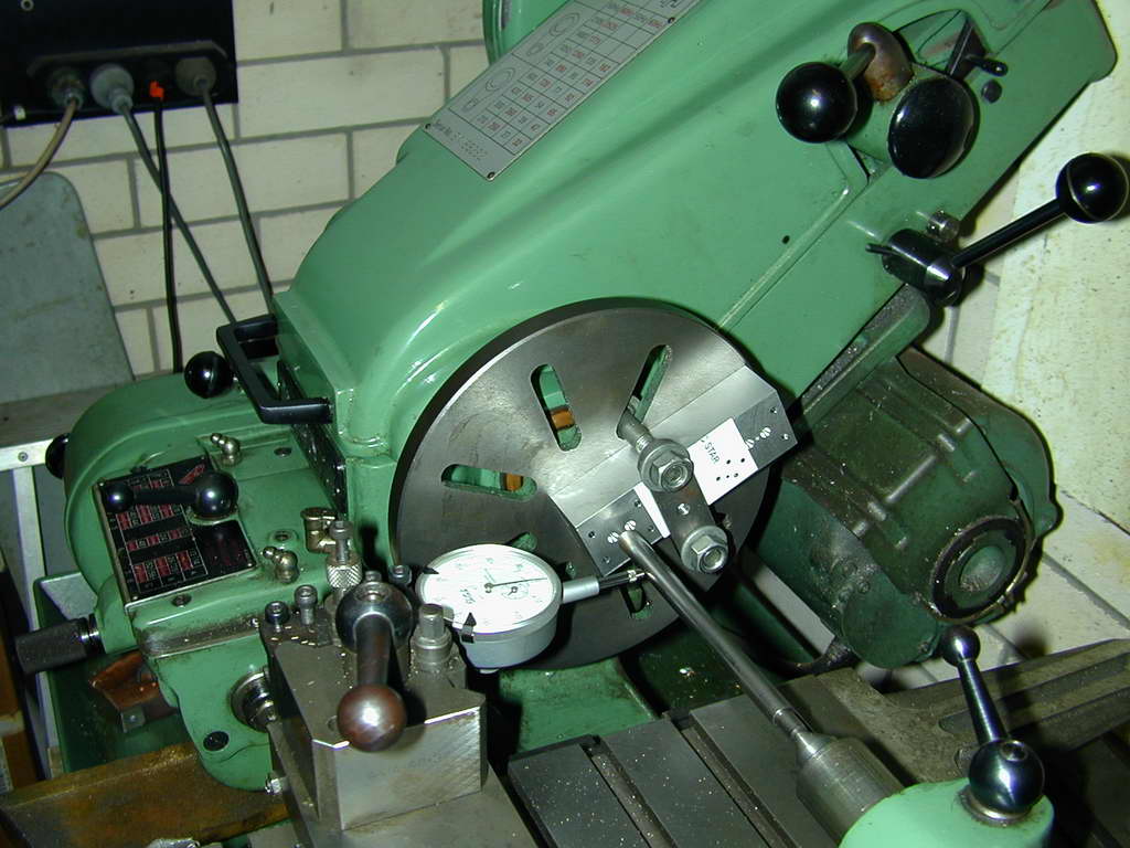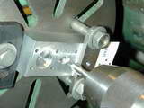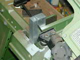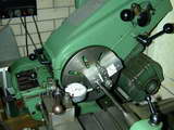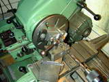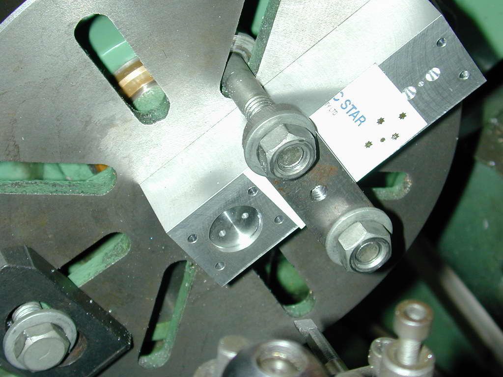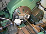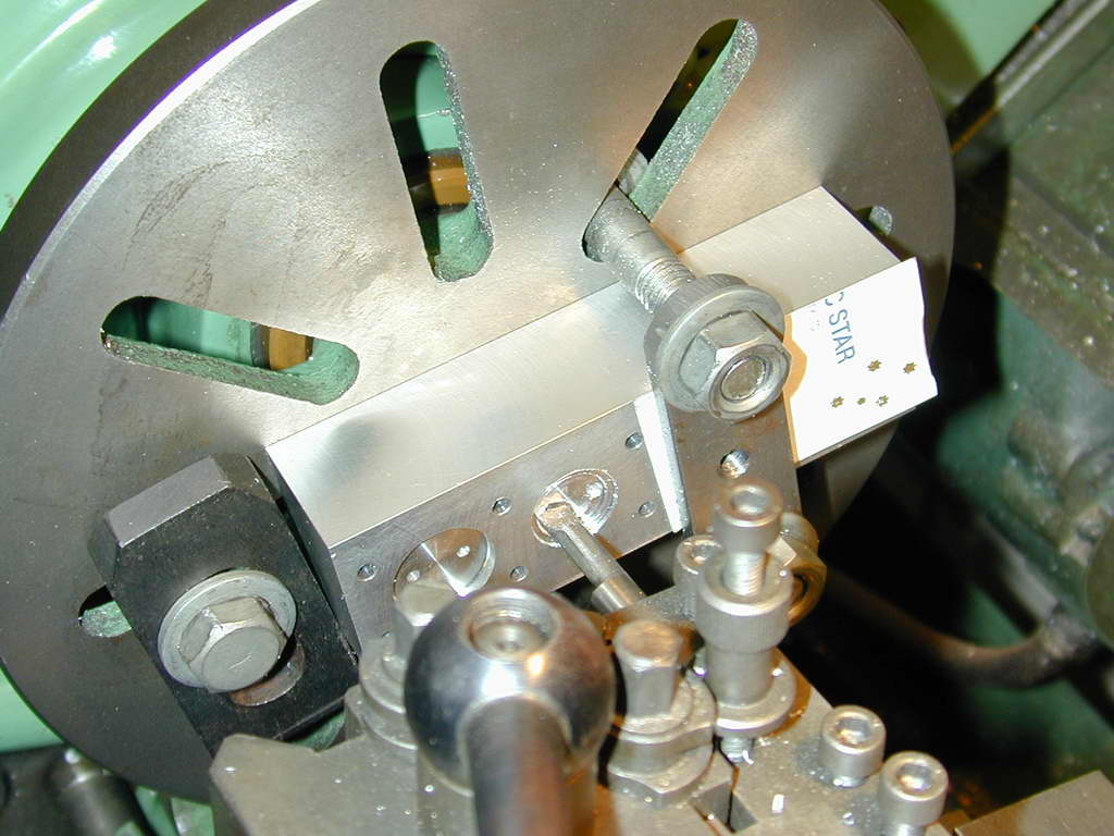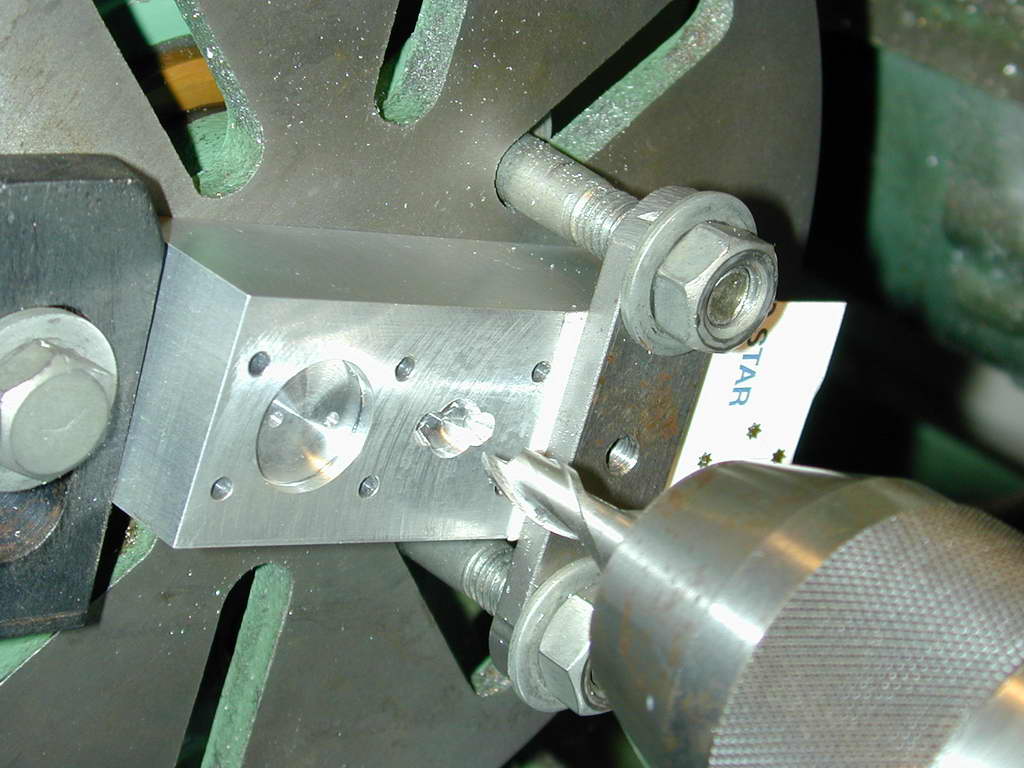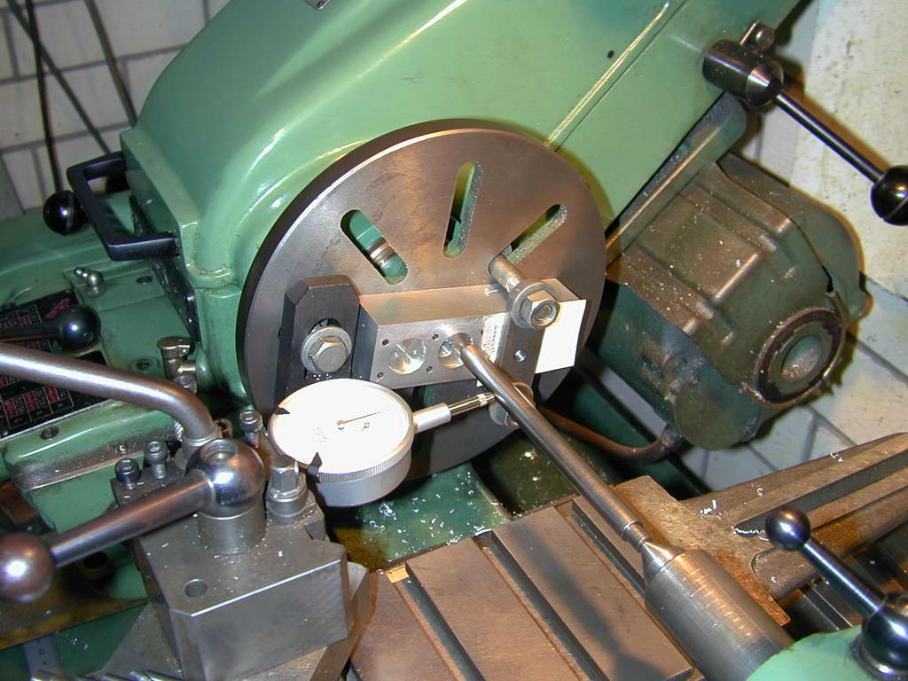This shot shows a dead-center in the tailstock being used to push a center-drill point against the face-plate, thus holding and aligning the head blank while the clamp nuts are lightly tightened. This gets the part within a few thou of the correct location, requiring only a few light taps of the plastic mallet to get the DTI running true to less than 0.001".