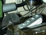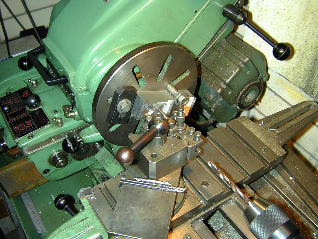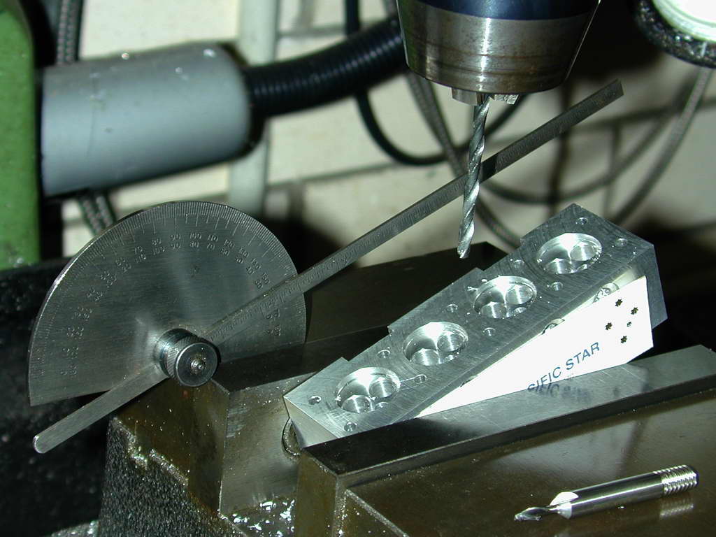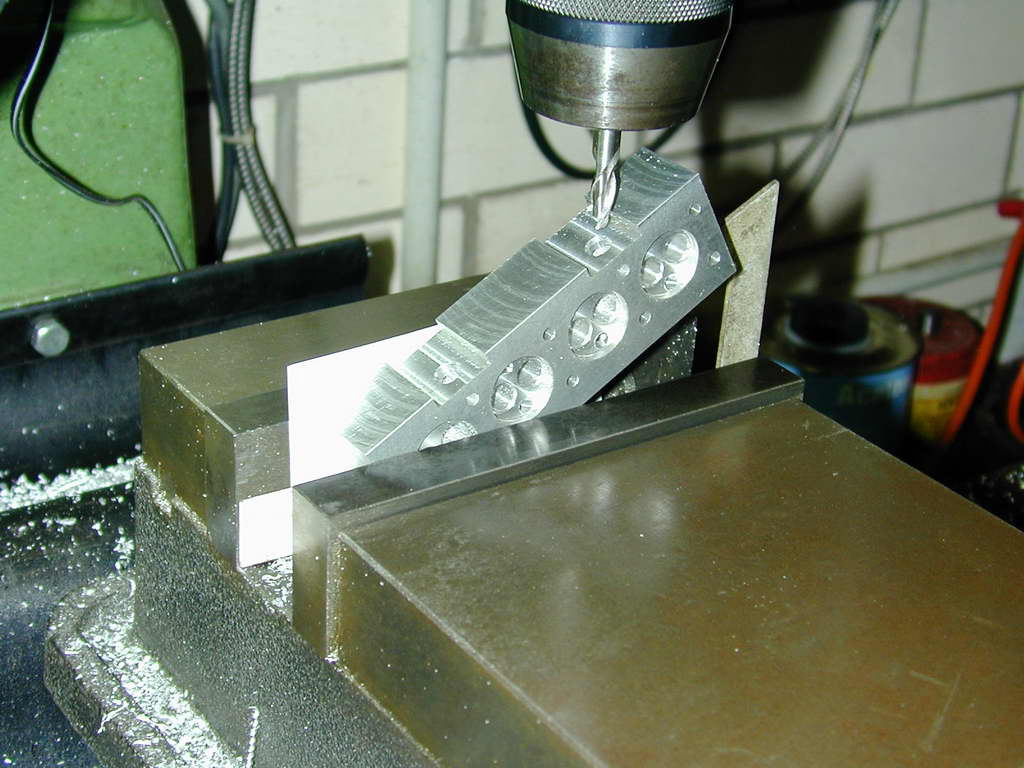 Similarly, the head is clamped at an angle to finish the inlet passages. The blind entry holes drilled in Photo #18 are 1/4". With the head at 30°, if a 7/32" slot-drill is centered in this hole, the passage can be drilled without touching the edges of the 1/4" hole so they intersect the inlet cavities radially. Amazing, and very satisfying to look at afterwards.
