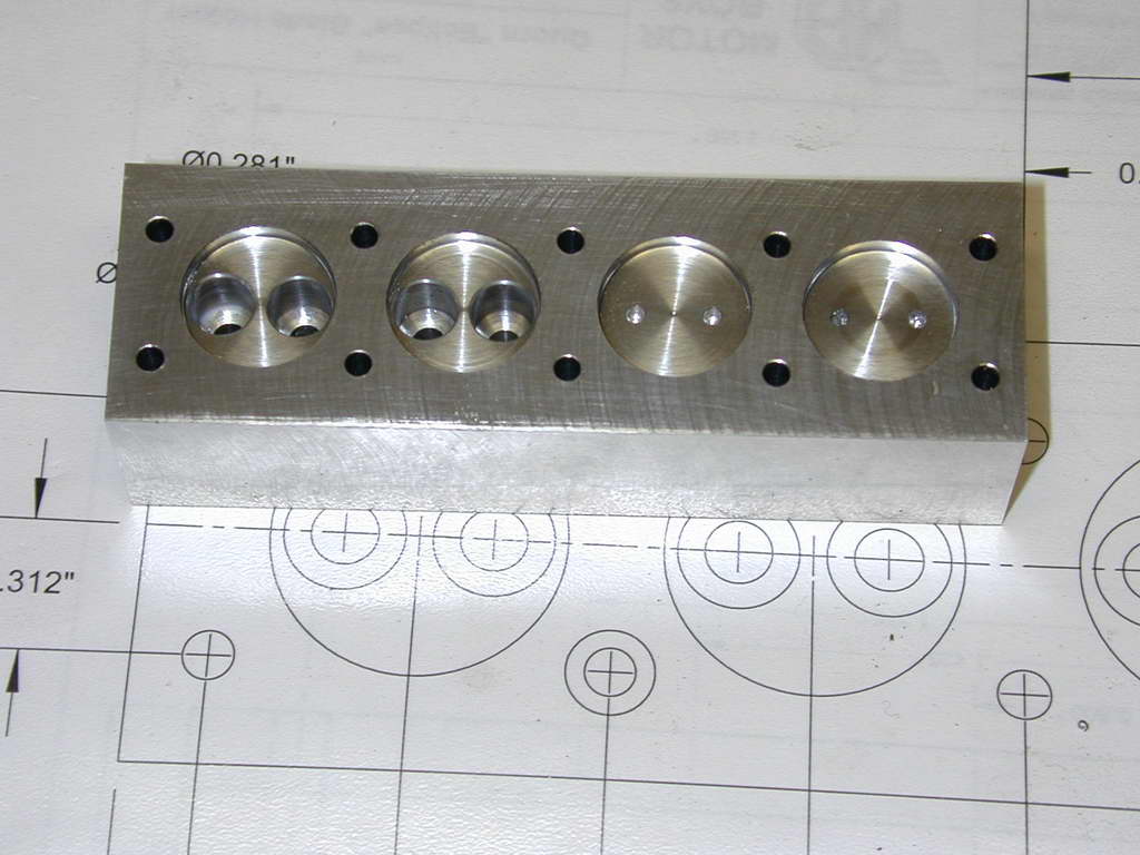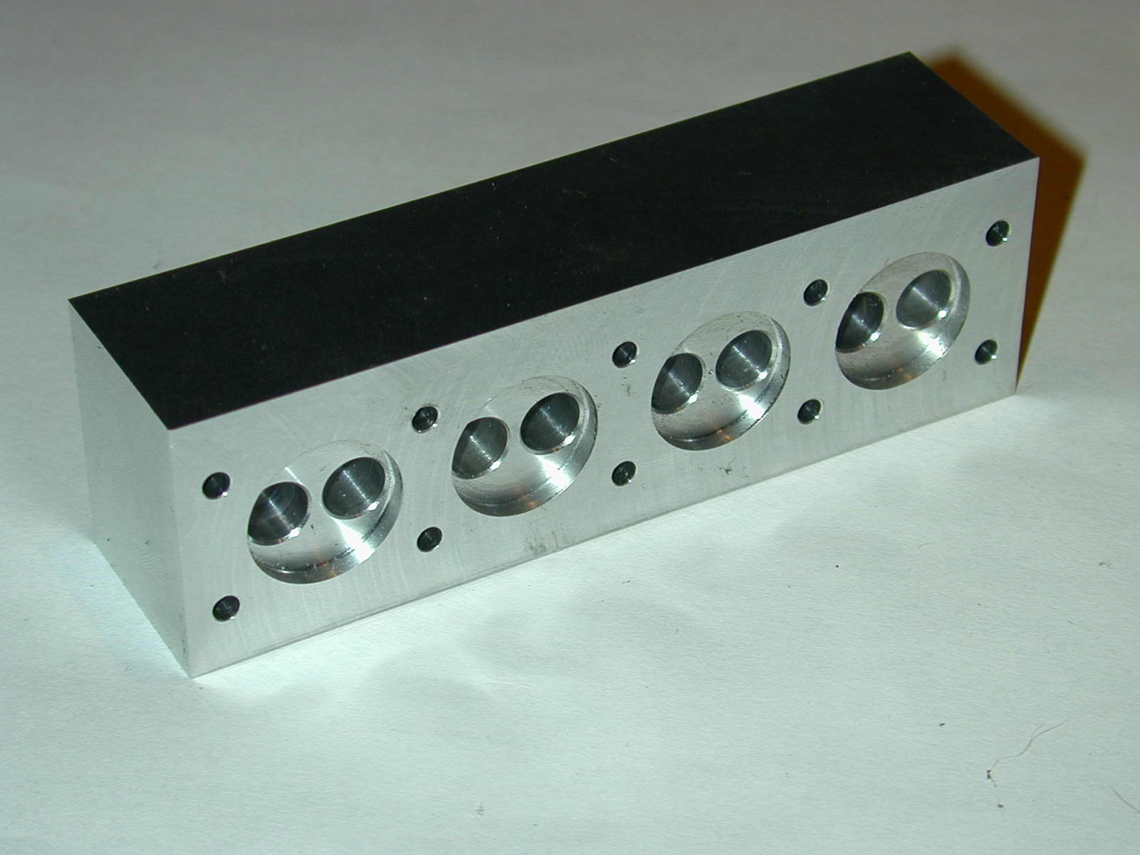 Here the recesses and entry holes for the Inlet Manifold are cut and drilled. Later, angled passages will be drilled from these blind entry holes to for bifurcated passages to pairs of inlet valve cavities.