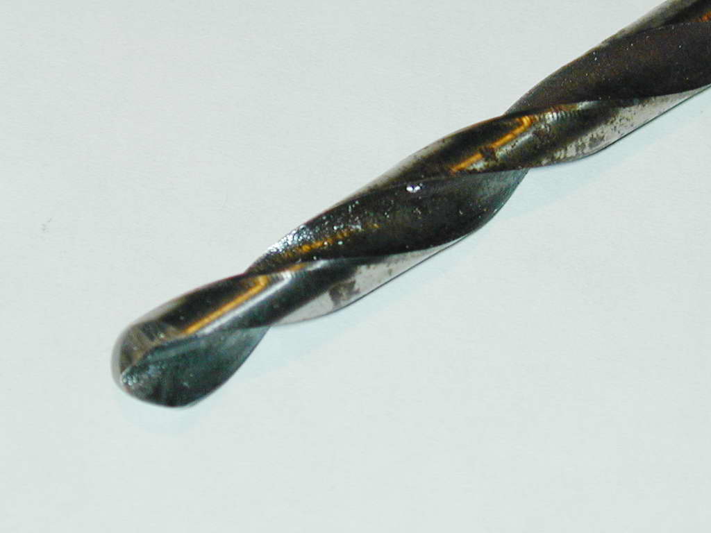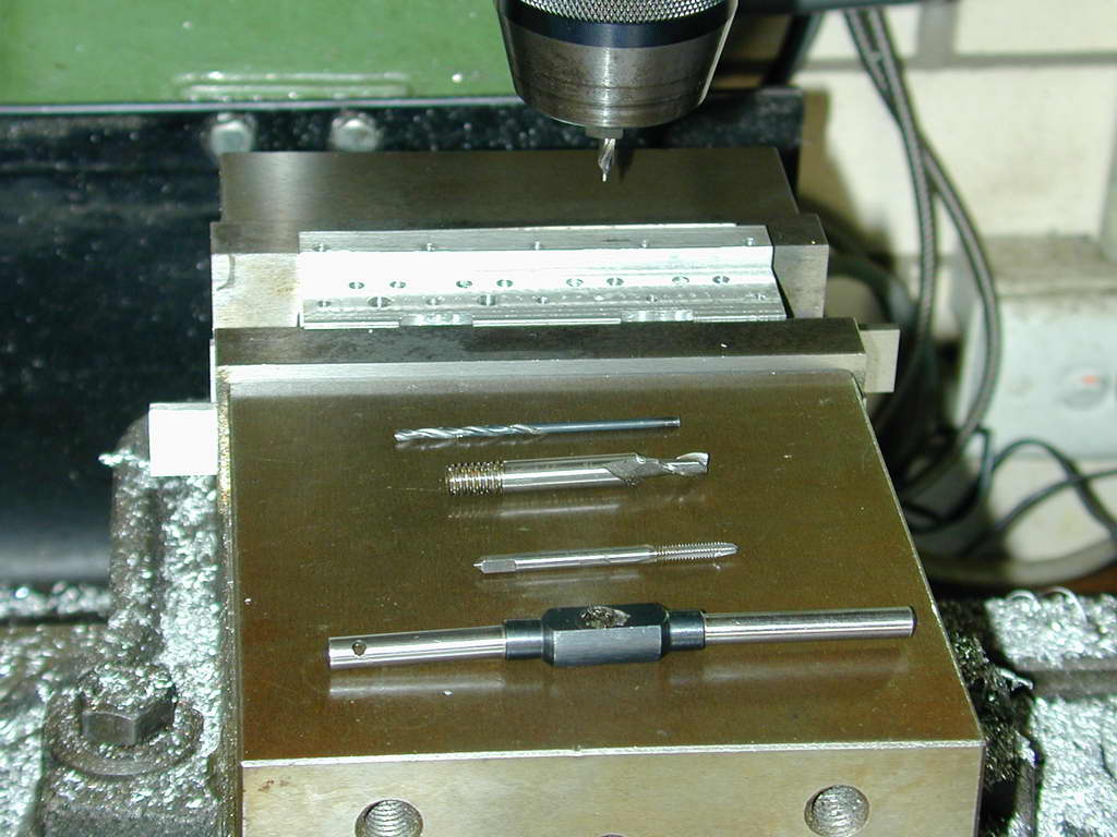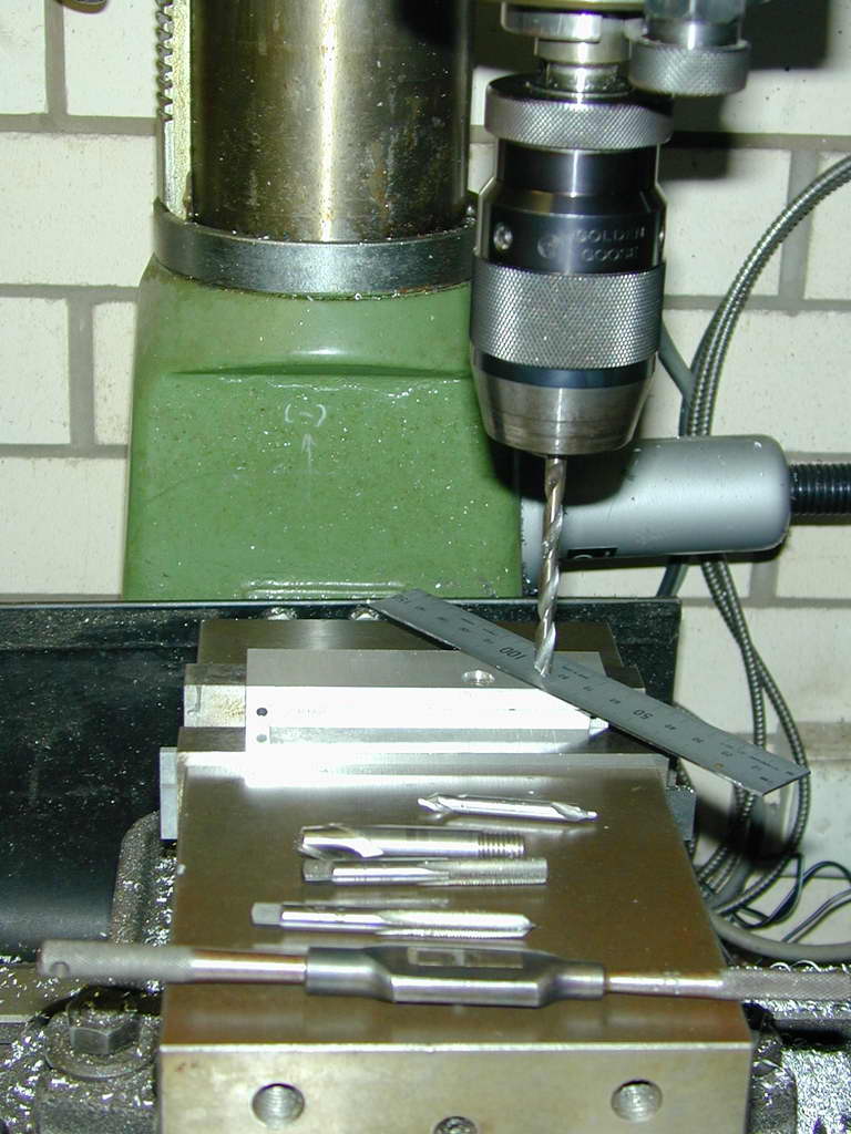 On the opposite face of the head, holes are blind drilled, counter-bored and tapped for the glow plugs. These holes do not intersect the head cavities; they end above and off-center from each head and will be connected later by a small, angled passage. After center-drilling, the tip of the tap-size drill is touched to a steel rule of known thickness. The hole is drilled to the required depth, plus the rule thickness.