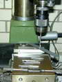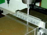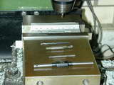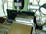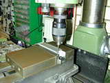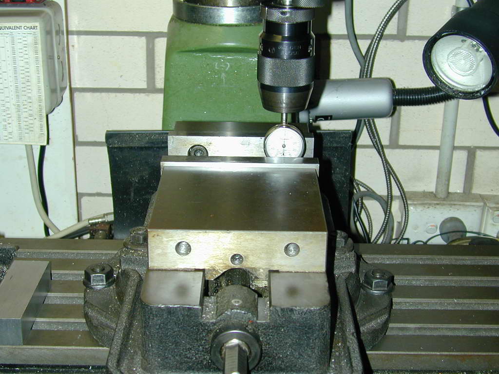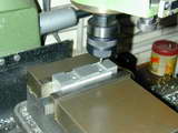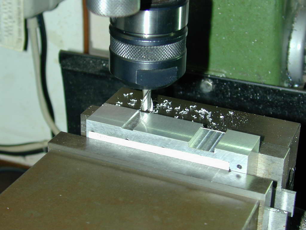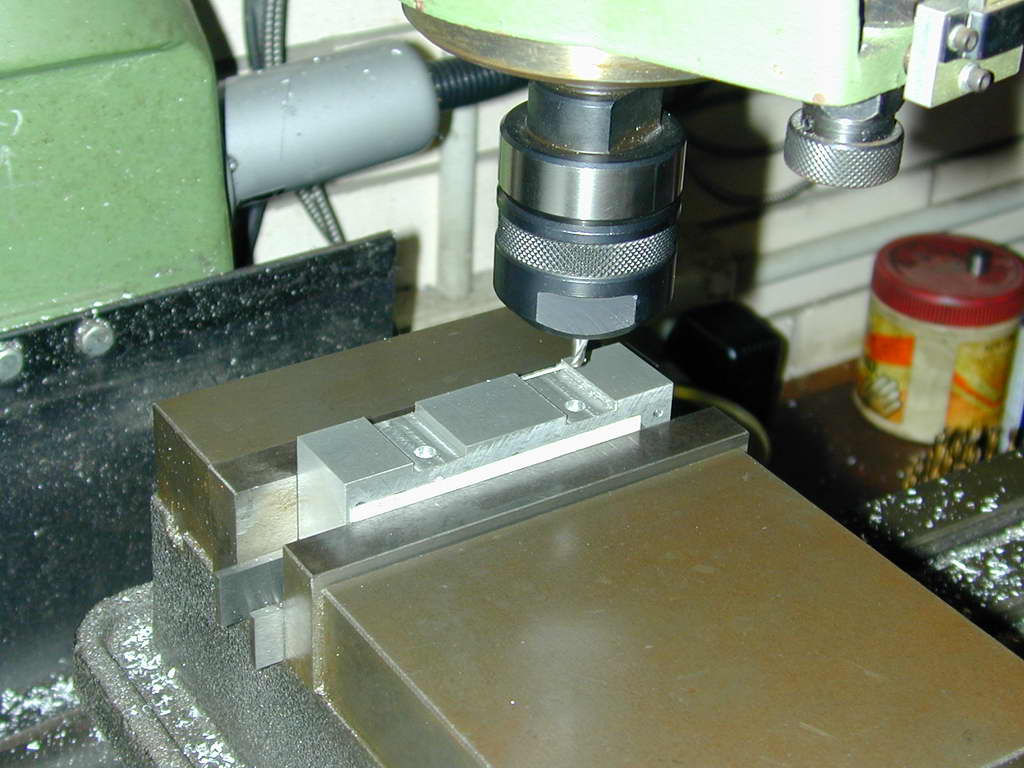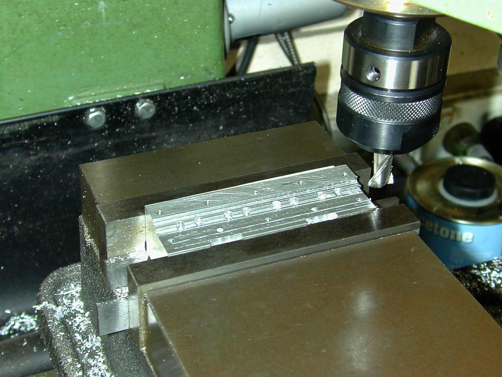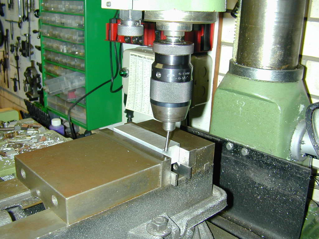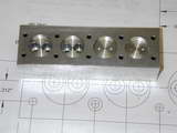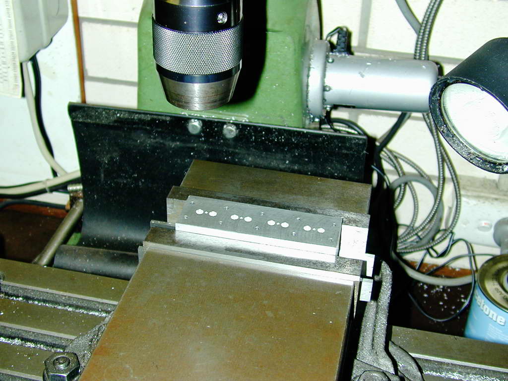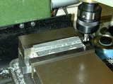 The mill vice jaws are carefully squared by traversing a DTI over the rear jaw until the error is as close to zero as obtainable. With the blank on parallels, an edge finder is used to locate the edges. The DRO is then set so zero-zero is in the precise center of the block. Using offsets derived from a CAD drawing, the 10 hold-down holes are drilled. The location of the head cavities are center drilled (carefully as the recess is only 0.090" deep), along with the location of the valves. The latter being deeply center drilled.
