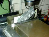 The head is flipped cavity side up and re-located with the edge-finder. The location of the passage from cavity to glow-plug is gently marked with a 1/8" slot drill. The head is then angled and the tip of a twist drill aligned in a recess, then replaced by a center drill to start the hole. The drill is replaced and drilled through to the bottom of the plug cavity. The hole is finally cleaned up with a slot-drill. Two slope to the right and two to the left. Great care was taken to get them right! Note the protractor used to set the block at the intersect angle in the vice jaws.
