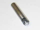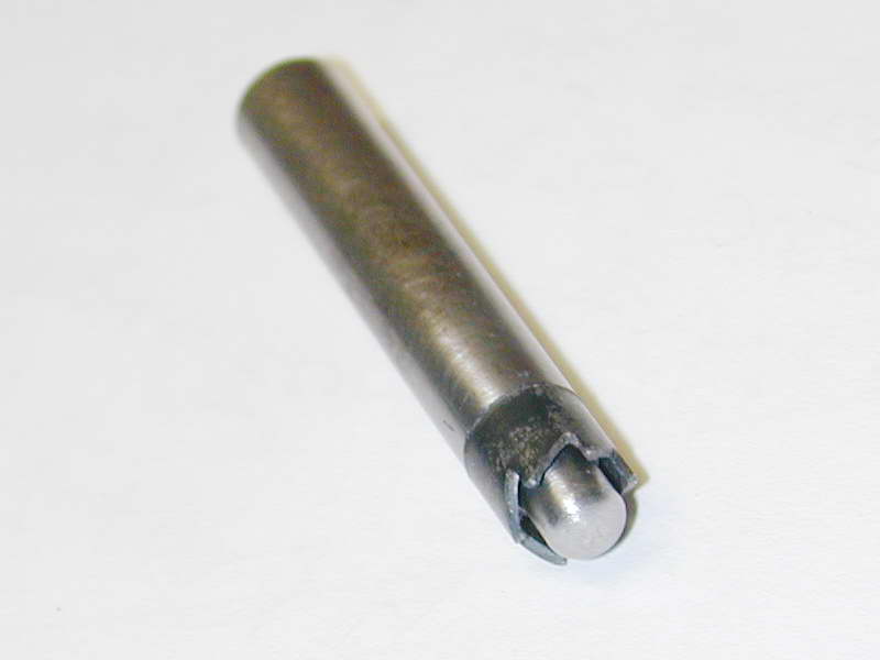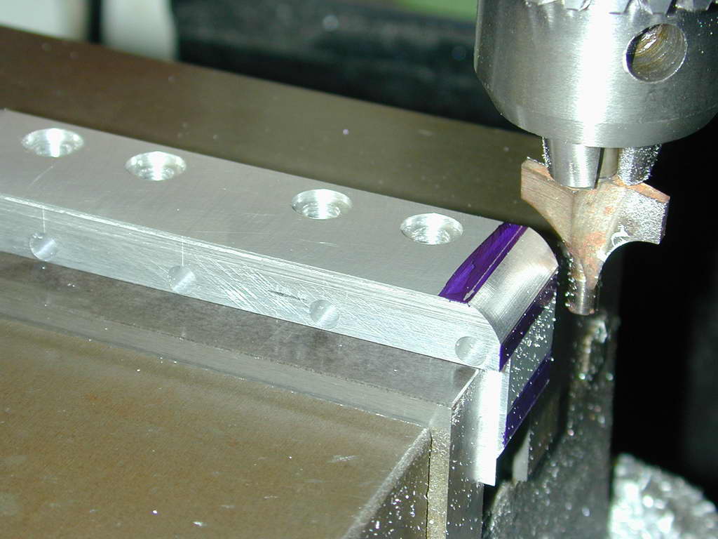 There's a last edge rounding job to do that requires a 3/32" radius cutter. The router bit design had worked so well, I made a replica from 1/4" drill rod. Relief was filed in before hardening and tempering. Without dressing up a very special grinding wheel less than 3/16" in diameter, I could see no way to sharpen this cutter, so I just relied on the edge left by milling the tow flutes. Remarkably, it worked fine and did the job just like its big commercial brother, even rounding the "blind" slots on the top of the head that I had no chance of getting a file into (Photo #33).
