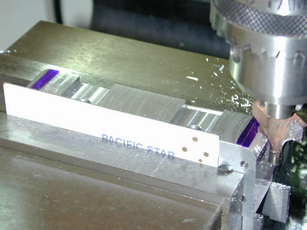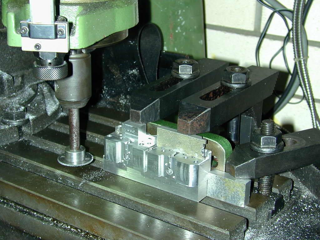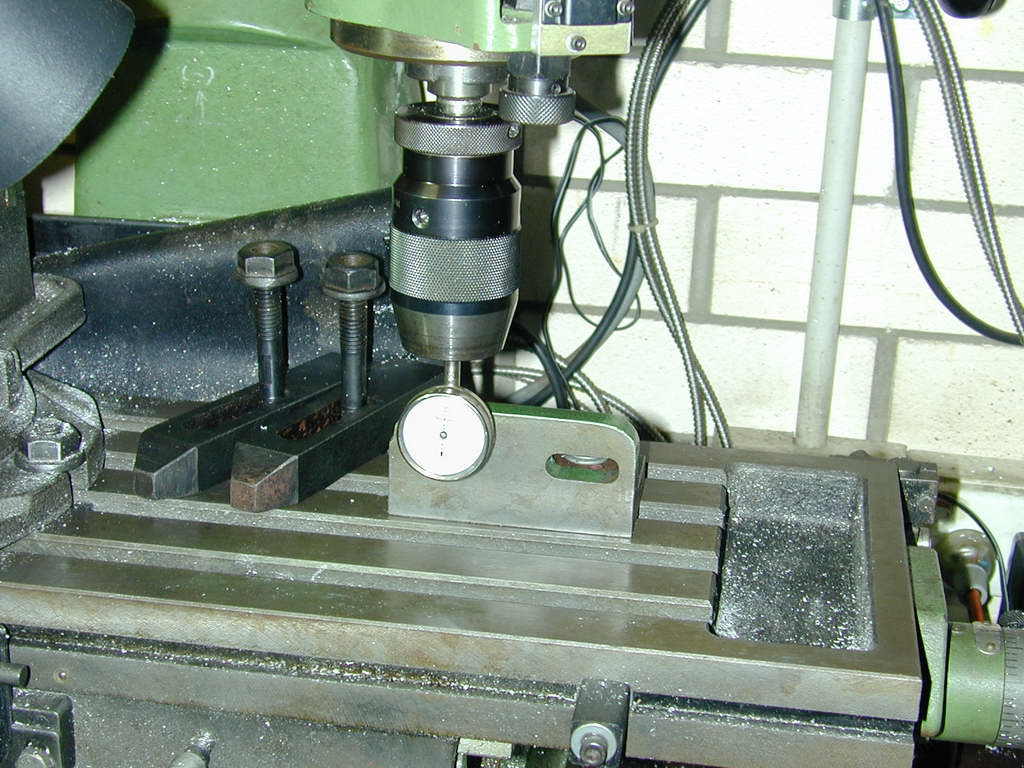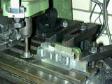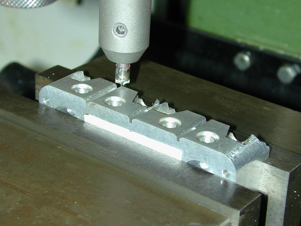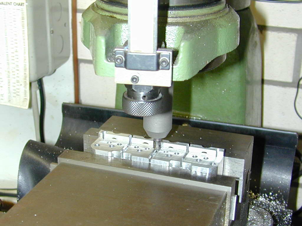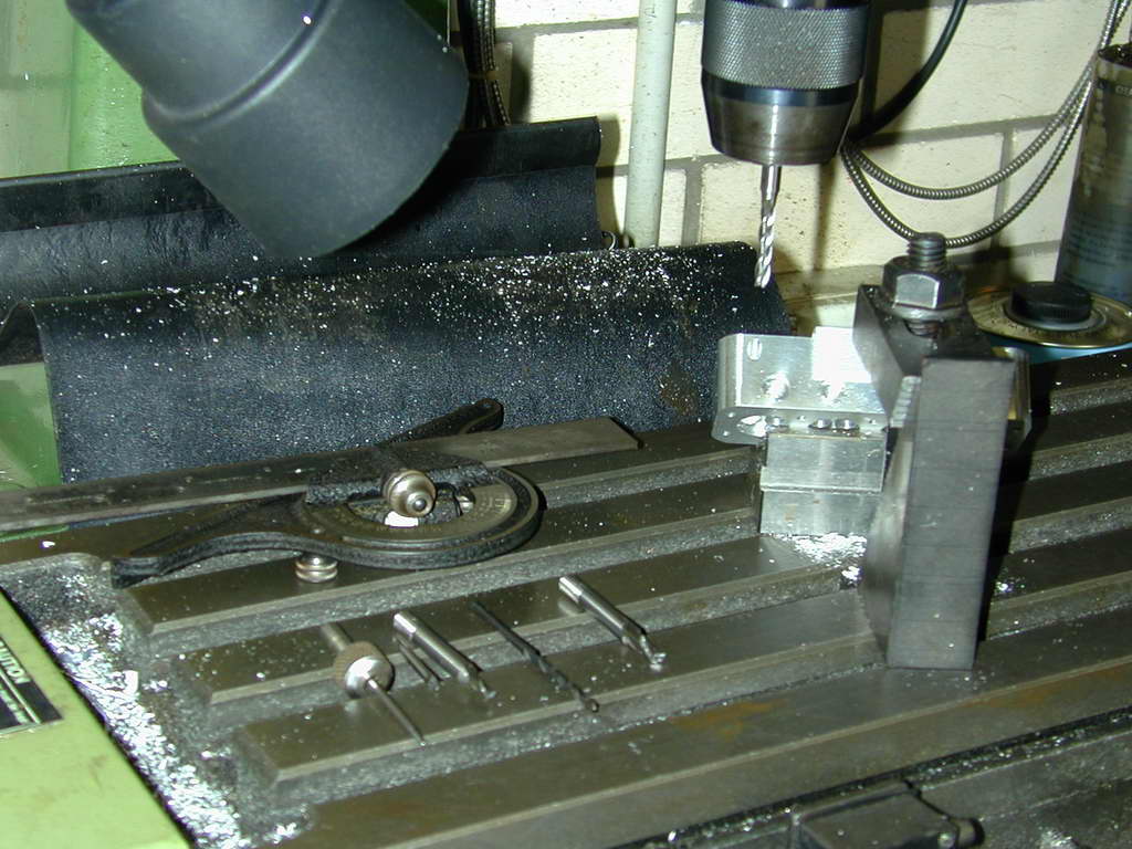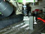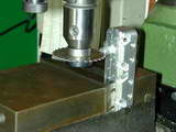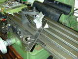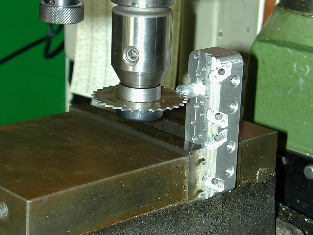The fins require a rather small diameter saw to get into some tight spots as shown on the SIC plan. To hold the work for this job, my small angle plate was bolted to the mill table and aligned with the X axis as a back-stop for the head.
