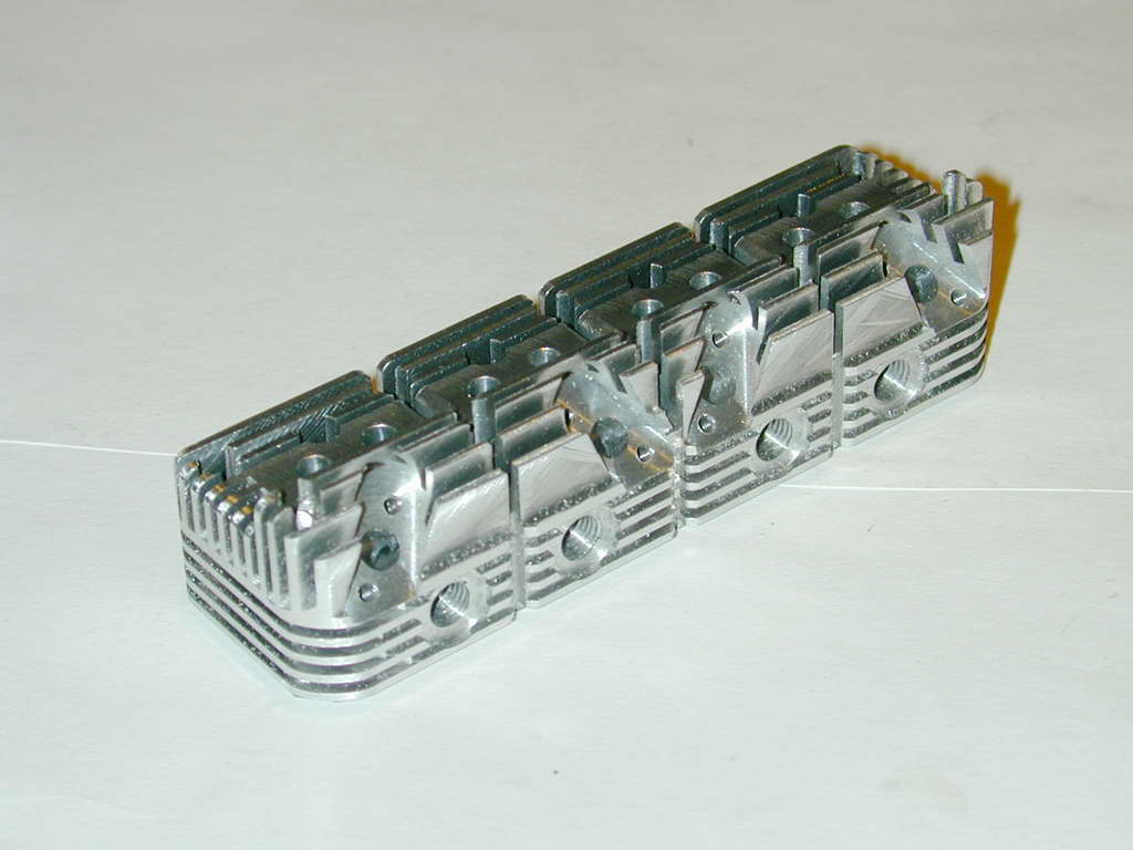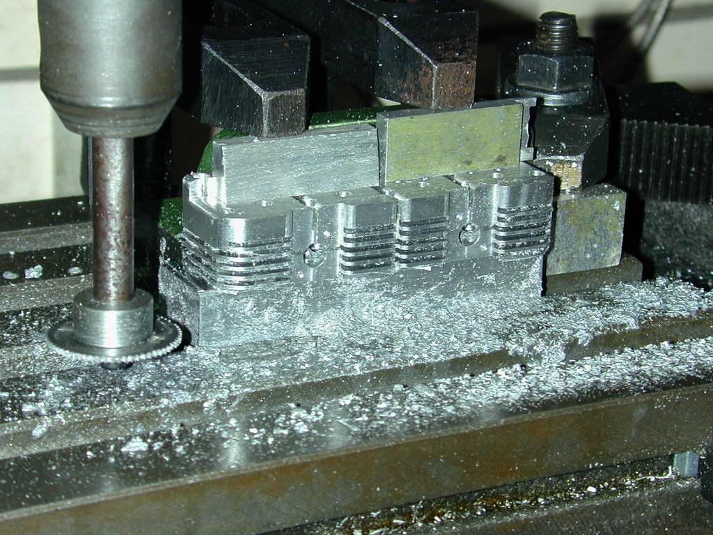 All the drilling and milling is now complete with the exception of the tapped holes to attach the exhaust and inlet manifolds. These will be spotted from the manifolds later, so we might as well make one last try the stuff the job by slitting the fins.