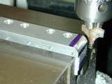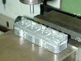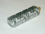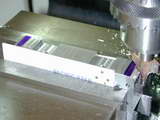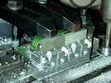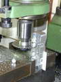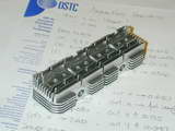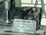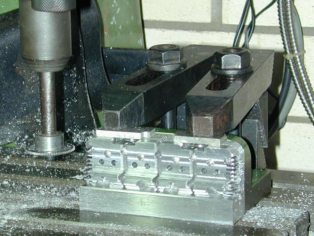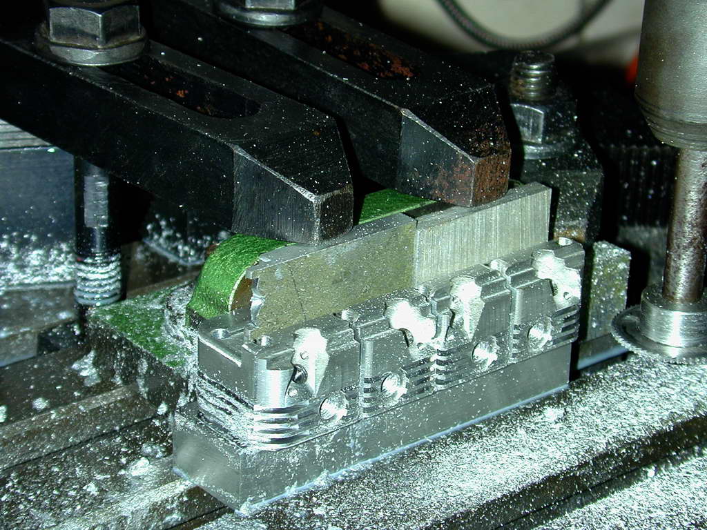 Photos #36..38 Show one end and inlet manifold side fins being cut. In Photo #36, the cutter on the home-made mandrel has been lowered to just touch the sacrificial block the head is resting on that allows the bottom fin gap to be cut. This Z axis reference establishes the reference that must be returned to for the second set of cuts. The clamping arrangement is not ideal; the clamp bolts should be as close as possible to the clamp point, but the set-up prevented that. Note also the separate end stop clamped down at the right to assist positioning when the head was reversed. Photo #37 shows the inlet side complete, and #38 the exhaust side. The fin line-up is as near to perfect as could be wished for.