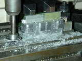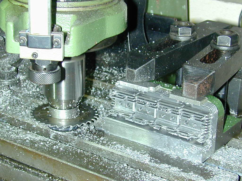 The top fins required another plan, but no "flipping". The small diameter saw was used on the front and back faces to emulate longitudinal fin gaps. Cutting the full length fins required a different cutter as the little cutter would not reach the depth required. The eagle-eyed will not cutting fluid residue in these photos. The slitting saw produces an aluminium powder that coats everything and if allowed to get into the cut, badly galls the finish. Squirting cutting fluid onto the saw clumps the dust up allowing it to be flung away producing a FAR superior finish than a dry cut.