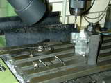 After drilling and tapping for the manifolds, the last job on the head is to mill a 1/4" recess 0.015" deep to center the valve springs. To ensure concentric alignment, I made a little piloted cutter. Rather than have a simple counter-bore, I decided to make it like a little hole-saw to produce channels for the springs. This was not as much work as it looks. a little ring of 1/4" drill rod was formed by counter boring and the teeth filed by hand; twice as it turned out, as the first lot faced the wrong way! The hole saw ring was parted off, hardened and tempered, then Locktited to the pilot mandrel. It really did not take long to make. Photo #43 shows it in use (the head being allowed to float). Photo #44 shows cutter and end result. The effect is very satisfying and certainly worth the extra effort.