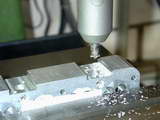 Photos #26...28 show exhaust ports being cut. Each port has a "pocket" for the exhaust manifold flange to bolt to. The actual ports are drilled at 45° while the pocket are milled at alternately plus and minus 30° to the longitudinal axis. One way (described by the Whittle SIC construction series) is to set over the mill head. I chose to jig it all up using V block to give the 45° and a protractor to clamp the V block at 60° to the X axis. A "sticky pin" was used to pick up the marked out entry point for the port axis (Photo #27). An end mill was then used to cut a flat for the center drill. After drilling through to the valve pocket, a slot drill was traversed along the X axis to mill the pocket so its outside edge would just meet the yet-to-be cut upper cooling fin.