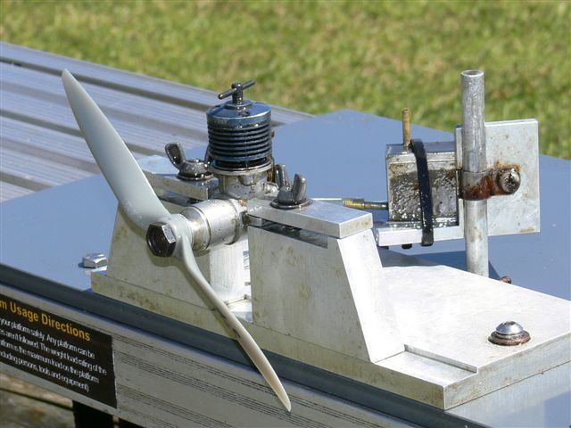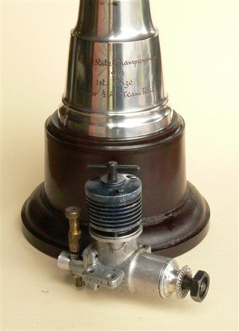The engine used and the trophy won in this event were kindly loaned to me by John Wallace, who also gave me permission to run the engine. This was done recently on a warm day in March. The fuel used contained 25% castor, 35% ether, 40% kerosene, plus 1.5% IPN. All props were bushed and balanced test APCs. The engine was firmly mounted in a machined alloy test-stand. As received, the backplate was indexed to give a vertical needle valve, one of the two possible positions.
