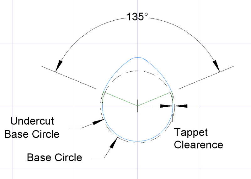 There is another cure: increase the "distance" between the open and close points to compensate for the tappet clearance. This is not as "hit and miss", if you'll pardon the pun, as it sounds, especially if you can model the thing in a CAD package. All the usual problems of juggling flank radii and nose radius to achieve the new cam angle still apply, and the acceleration figures produced by CamCalc will go out the window as they assume tangential cam contact starting at the flank to base circle intersection point. In both cases, there will be a hammering effect as the clearance is taken up. That procudes mechanical noise, which some believe adds to the charm of the running engine!