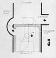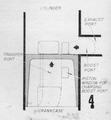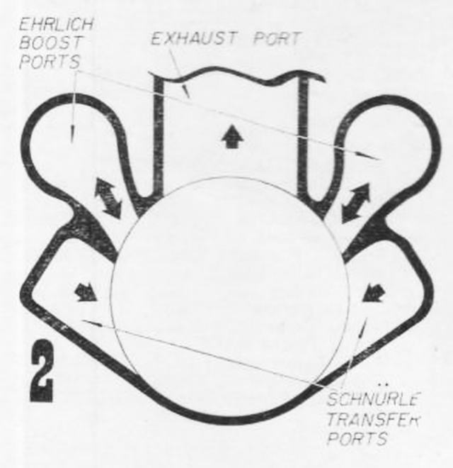 CONFUSION EXISTS AS to the nature of boost ports and how they work, arising from the review of my 10 c.c. engine in the May, 1962, issue of AEROMODELLER. There are two forms of port now in use, loosely termed "boost port". One is the form of port positioned diametrically opposite the exhaust port in Schnürle system engines (Fig. 1) whose function is to utilize the gases under the piston crown and so increase scavenging efficiency. The timing was originally rather "short" in relation to main transfer port timing, but subsequent development has enlarged this port, with increased understanding of its potential, until its chordal width is now governed solely by the room available before the positioning of the main transfer ports is detrimentally effected. In the same manner, the port height has increased so as to equal in some cases the height of the main transfer port. A second point with this form of port is that the thermal stresses on the piston are considerably reduced, due to the circulation of cool charge directly under the piston crown. The apparent upper dimension of the port is not necessarily its true time-area, as for reasons of mechanical strength, it is impossible to cut a relating window of such chordal width in the upper regions of the piston. Therefore the piston port is normally narrow and deep, which naturally modifies the flow characteristics of the port. (Fig. 3). In fact it is worth experimenting with the shape of this piston window to find the optimum performance of the port as a whole. The manner in which this is done depends on the concept of the designer. It has been used with outstanding success by the M.Z. designer, Walter Kaaden, who obtained a 20 per cent. power increase by combining this port with the standard Schnürle system. This form of port is not really new. Its use dates back to pre-War derivation from the Schnürle patent, which was used by Zundapp motorcycles of the period. Description of my 10 c.c. engine in the May issue aroused considerable controversy and I ought to make it clear, that the above is the type of port used. The second type of port in use is the Ehrlich boost port, for which patent No. 824,673 was granted in 1956. It is the invention of Dr. J. Ehrlich, the well-known two-stroke designer. The object of this port is identical to the type just described-i.e., to increase scavenge efficiency-but the principle is entirely different. These two ports are situated between the normal Schnürle ports and the exhaust port, at a similar angle to the main transfer ports. (Fig. 2.) The operation of the port is as follows: near the maximum crankcase pressure for the desired operating r.p.m., two windows set high in the piston skirt uncover and charge the boost ports shown in Fig. 4. The piston continues its downward travel and the remaining charge in the crankcase is transferred at low velocity into the cylinder via the main transfer ports. Shortly after this main action, the boost ports open and pass their charge at high velocity into the cylinder. This gives in effect a two-stage transfer system which, with the development work carried out by Dr. Ehrlich, has been made to yield an impressive power curve which is much "fuller" than that usually associated with two-stroke engines of that power output. As can be seen, the idea is capable of many variations. As regards dimensions, their limit of chordal width is dictated by the need to avoid upsetting the main transfer port positioning, and the excessive proximity to the exhaust port which, apart from raising the temperature of the stored charge, will lead to undue charge loss or pollution. No information is available on the volume of these ports, but I would "guesstimate" that they represent a potential 15-20 per cent. of the total transferred charge. As to height of the ports in relation to the main transfer ports, I should imagine their value to be approximately 70-80 per cent. of the latter. Comparing the two systems just described, we see that, in terms of positioning as regards directional gas flow, the Ehrlich system would seem to have a better potential. The other system can tend, if not very carefully designed and timed, to reduce effective filling by pushing the normal Schnürle loop nearer the exhaust port. In conclusion it is essential to realize that both forms of port are, as their name implies, secondary in importance to the normal porting used in modem racing two-strokes. Correct application can yield great improvements in power and power characteristics, and I feel boost ports have great potential in the future development of the two-stroke engine.
