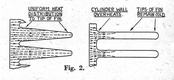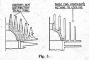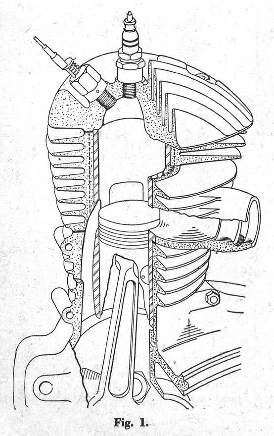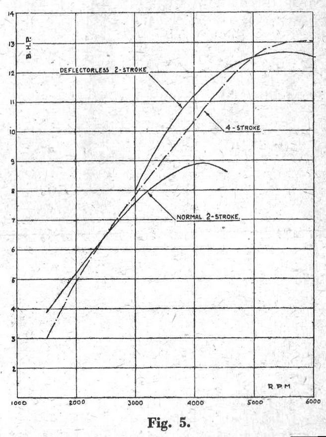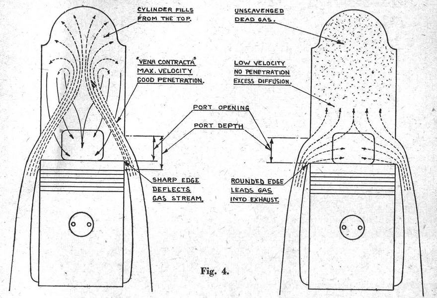 AS information on modern flat-top piston . two-stroke engines is scarce, the following details of a description which appeared in the "Automobiltechnische Zeitschrift" No. 14, 1940, are particularly interesting. Fig. 1. A cut-away view of the engine, copied as closely as possible from the original, shows many points of interest. One of the problems in a high performance two "stroke engine is to provide adequate cooling. In this respect the flat-top piston, cross-scavenged engine with its symmetrical arrangement of ports .is at an advantage. Light alloy cylinders permit increased performance with low weight. Plain cast-iron liners pressed in a light .alloy jacket are unsatisfactory, because capillary attraction draws oil into the interface where it carbonizes and forms a heat barrier; such a liner was found to be 300 C. hotter on the working face than a plain cast-iron cylinder with cast-iron fins. Screwed-in liners are equally unsatisfactory, owing to the lack of intimate contact between the two metals, and to differential expansion, causing distortion. . In the 250 c.c. "Ardie"· engine, a light alloy jacket is cast around an iron liner with longitudinal ribs. This arrangement increases the contact area by over 100 per cent, thus compensating for the" heat barrier," permits the liner to expand longitudinally without distortion, and the radial distribution of the ribs maintains contact during differential expansion. A reduction of liner temperature by 40° C., and of piston clearance from 0.0035 in. to 0.0023 in., for a 61.05 mm. bore cylinder, was achieved by these means. The fins cast on the light alloy jacket are proportioned to take advantage of the high thermal conductivity of the material, and increase to a depth equal to the cylinder bore on the leeward side of the cylinder. The thick base fins also contribute to uniform circumferential temperature distribution. Fig. 2 shows the approximate heat path in two cases, and proves that paradoxically the coolest cylinder is really the hottest. The same principle of heat flow is observed in the cylinder head, Fig. 3, and the eccentric disposition of the cylinder fins blends harmoniously with a " streamline" or "teardrop" elevation. The crankcase is called upon to heat dissipation by raising the joint face to the level of the transfer ports and 'liberally finning the upper portion. This arrangement, used by Mr. Westbury in his" Kestrel" and several other engines, permits the ports and transfer passages to be machined, an important point in utilizing the inertia of the gas columns to secure maximum volumetric efficiency. In this way the efficiency of the crankcase as a pump can be doubled. Perhaps intentionally, the least clear part of the original drawing is the exact shape of the transfer ports. Obviously they are steeply upswept, 60 deg. or more, and carefully blended into the transfer passages. The exhaust ports are 27 per cent stroke deep and the transfer ports 30 per cent. As the former have 5 per cent lead the effective height of the latter is reduced to 22 per cent., the remaining area not being uncovered by the piston. An explanation for this state of affairs is offered in Fig. 4. How each of these details contribute to the final result can be judged from the power curves for three 250 c.c. engines shown in ' Fig. 5. Those for the normal two-stroke and the four-stroke have been verified as representing average results by first-class makers of normal commercial engines, that is not specially tuned. The deflector-less two-stroke is of the same category. The normal two-stroke gives more power at low speed than the four-stroke, but the flattening off of its power curve puts it at a disadvantage at high speed. The deflector-less two-stroke is markedly superior over a substantial speed range, and only slightly inferior at its maximum. In a 30 c.c version 3 b.h.p. should be developed at 11.000 r.p.m. One day it will be tried out, probably in 05 c.c. capacity.