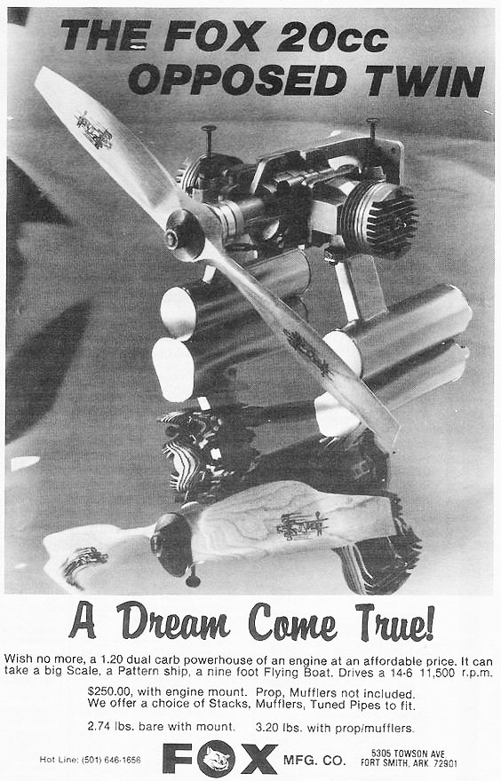 This incredible twin, American made, limited production, and the only genuine Fox ever manufactured, is just now some 15 years off the market, beginning to catch on with multicylinder engine collectors. Peter Chinn, in the July 1980 MAN has a detailed (as only he could) article on the Fox twin, but treads lightly on the "problems."