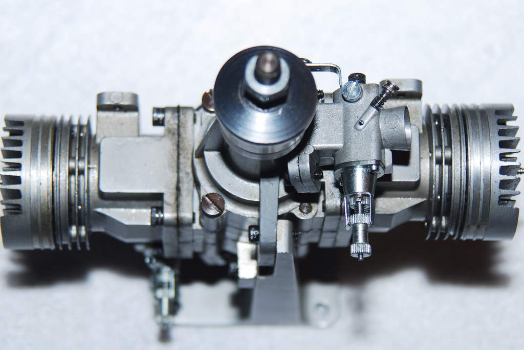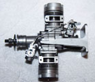 In November 1980, Clarence and Duke were at a U-control contest in the Sepulveda Basin, (Calif.) and struck up a conversation regarding the flameout problem of the twin, and Duke noted "they" had found by blocking off the two boost ports this would eliminate the problem with a minimum power loss. Simply put, blocking off the boost ports directly opposite the exhaust stopped the incoming fuel charge from putting out the glow plug. This was accomplished by rotating 1800 the paper gasket that seals the joining surface of the cylinder to the crankcase. But by then the market for large and powerful engines was growing with new four-strokers and "chainsaw" type engines and the twin's potential was lost. And loud...gosh one can't imagine its vroooommmm!