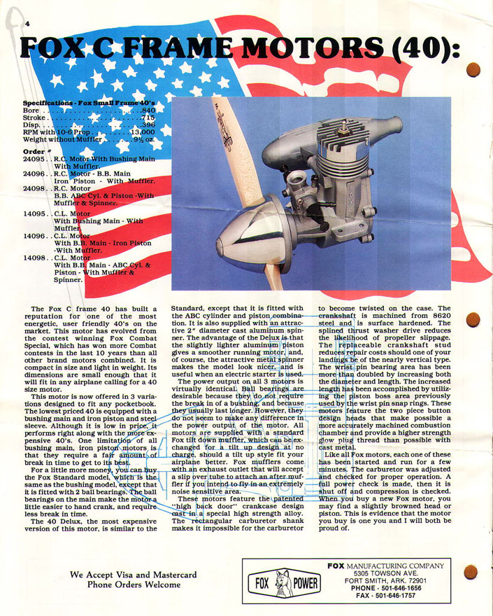 "Our Fox 19BB, 40BB and 50BB are our top line motors. Materials used are top quality and the best we have found for the purpose. All cylinders and bearing surfaces have been hand fitted for optimum clearance. All_motors have been test run at full power and all needle valves have been adjusted to normal operating adjustment. We pay less attention to cosmetics than our competitors, but nobody takes the care we do to insure that your motor will start readily, run right, and fly your airplane with authority. Buy one-you will be happy that you did"!