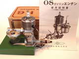 An all brass needle unit, centered on the intake and tank had a gits cap next to it. The round tank ring held the plastic tank securely. Internally the cast, ringless with baffle aluminum piston was worked by a cast, bushed rod, working the steel crankshaft set in a brass bushing. The open "Bunch type" timer, the drive washer/cam, aluminum prop washer and steel nut complete the engine. The bent timer arm has an attractive, small plastic tip in place. All work, machining, castings, etc. were of the highest order with the engine being all "silver" aluminum in color. "OS" is on the front of the case casting, the bypass cover, one lug and the serial number stamped on the other lug. Full "modern" running instruction, safety warnings, wiring diagram and all sorts of hints are part of the paper package. Flawlessly manufactured by O.S. and never to be done again. Initially offered at $250 a flurry of discount activity dropped to the $160-$190 range in Feb. 1988. Engines were scooped up by collectors and today some 10 years later it is seldom that one comes into the market and if it does the price has doubled.
