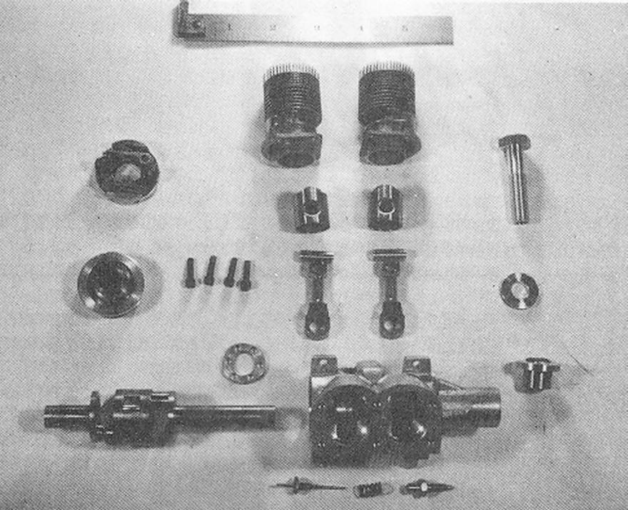 Utilizing the many years of Mr. Lebeda's engineering skills with full size engines such "innovations" as a one piece crankshaft with internal dual ported rotary valve, a venturi type carburetor, a needle valve design that causes the fuel to be released into the air mixture in molecular form for better induction and more complete combustion, a narrow sleeve bearing under lightly loaded conditions, running with almost the same amount of friction as ball bearings, are a few of the ideas incorporated in the PAL 55 engine. (One has to ask, why the 55 displacement and why an inline twin as a first production model, notorious for cooling well.) The engine's carb was on the underside, the timer assembly in the rear, and the exhaust a "hang on" type like the Barker 60 Manulmatic. A laboriously designed "metal cylinder cowling," necessary for the cooling of the cylinders is pictured on the front engine in the group picture below. That picture also shows the hang on metal exhaust stack for both cylinders.