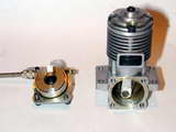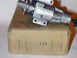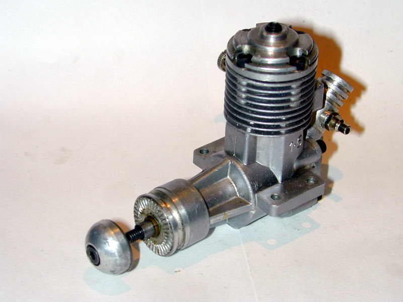 The Sesqui was a diesel of uncommonly sophisticated design for such a small motor. It had a displacement of 1.5cc (.09 cid) hence the name Sesqui, which in Latin means one and one half. The engine in marked contrast to most motors of less than 1.5 cid has such features as twin ball bearings, Schnuerle scavenging, a rear rotary drum valve and rear exhaust. It is built around an intricate but sturdy investment casting comprising the crankcase, front bearing housing and finned cylinder casing. The counterbalanced crankshaft supported in steel-caged shielded ball bearing journals, front and rear, has a 7mm diagonal main journal, a 5mm front journal and a 4mm pressed in crankpin.