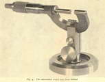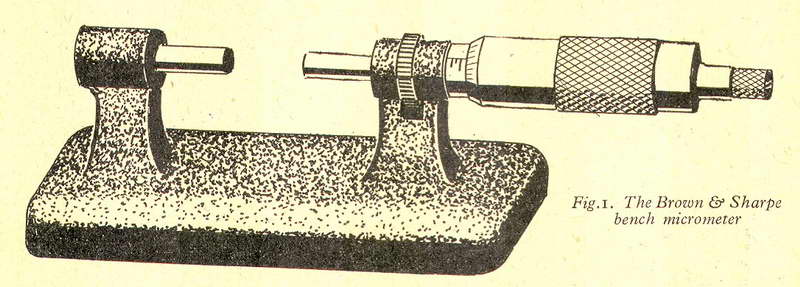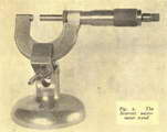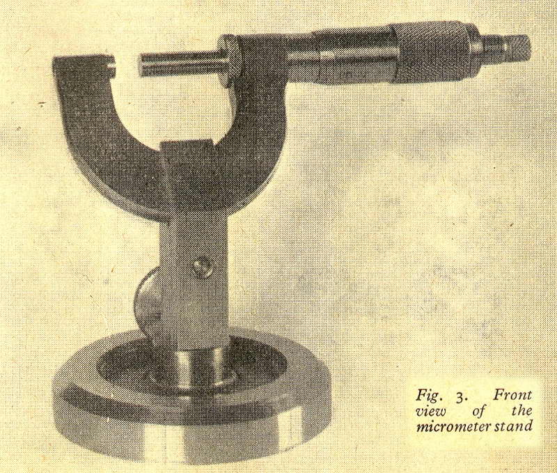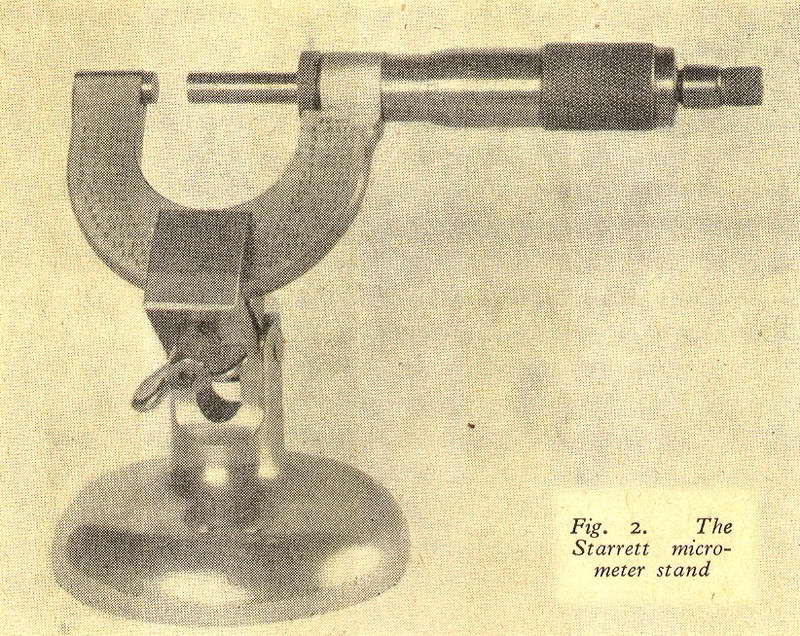 To enable the micrometer both to be applied to parts mounted in machine tools and to be used to the best advantage on the bench, a form of stand is usually employed that allows the micrometer to be quickly clamped in place or removed for handling. The Starrett micrometer stand, shown in Fig. 2, is made to serve this double purpose, and a single bolt and wing-nut is fitted both for clamping the micrometer and for locking the pivot joint which allows the instrument to be tilted to a convenient angle for reading the scale. A further advantage of using a stand of this kind is that there is then no need to lay the micrometer on the bench or on the lathe bed where it is liable to suffer damage; instead, the instrument is always kept mounted in its holder, which stands either on the bench or on the lathe tool stand. Making a Micrometer Stand