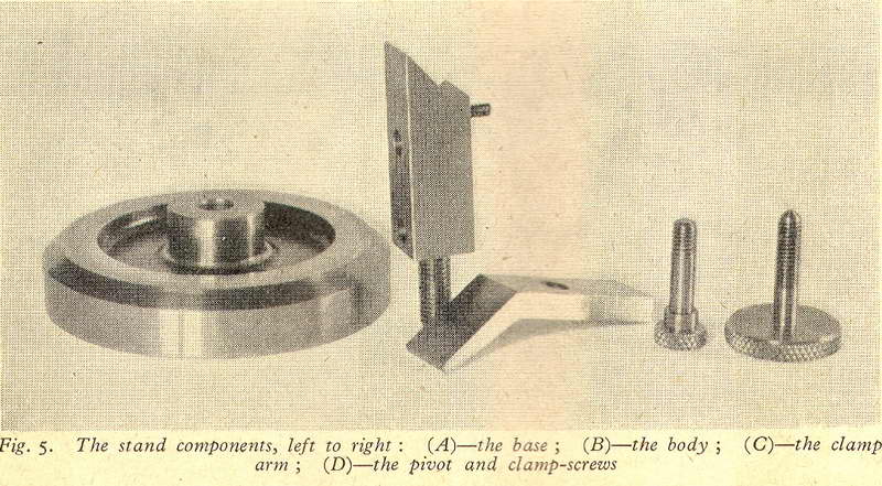 As a result of making enquiries of tool merchants, it appears that micrometer stands are no longer obtainable in this country. Recently, a second micrometer stand was required in order to save the inconvenience of having to use a single stand to serve two or more micrometers. It was decided, therefore, to make a simple form of this appliance that could easily be built from scrap material and yet would do all that was needed. As it was found that a single position of the clamp was sufficient to enable the micrometer to be easily read, a fixed form of clamp was employed which did not permit of angular adjustment. To keep the front of the stand free from obstructions, the two screws actuating the clamp were placed at the back of the holder. The finished stand is shown in Figs 3 and 4, and the component parts are illustrated in Fig. 5 and in the accompanying working drawings.