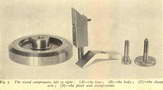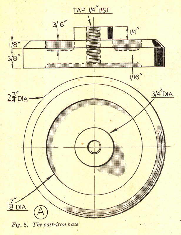 The Base (A)This was made from a discarded iron casting originally intended for the jockey pufiey of a drilling machine. The precise dimensions of this part are, of course, unimportant, as long as the casting or other material used is heavy enough to ensure a stable mounting for, say, a 2 in. micrometer. The casting is first gripped in the ,chuck for facing the upper surface and boring and tapping the central hole; at the same time, the recess is turned to a good finish with a round-nosed tool.