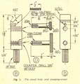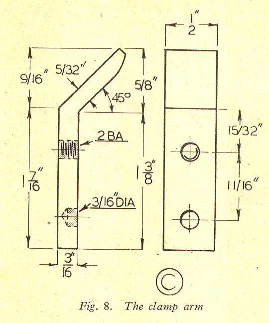 The Clamp Arm (C)The clamp itself works on the principle of the ordinary toolmaker's clamp, but it is rather less efficient, as the actual clamping surface lies at an angle to the actuating screws; nevertheless, a 2-in. micrometer is held quite firmly with only moderate tightening of the clamp-screw. The clamp arm is cut to shape with hacksaw and file, and it will be noticed that the clamping surface is made slightly curved towards its tip to allow for the rocking movement imparted when the clamp is tightened; for the same reason, the hole to receive the small pivot screw is threaded for less than the full thickness of the material. The recess in which the lower clamp-screw engages is deeply drilled with a centre drill in order to afford, a good bearing, and so check any tendency for the clamp arm to rise when the clamping pressure is applied. When drilling the clamp arm, it is best to secure it in position on the body with a toolmaker's clamp; the body will then serve as a drilling jig for accurately locating the holes.The Actuating Screws (D)When mounting a micrometer in the stand, the pivot screw is tightened until the clamp is closed on the bow, with the lower limb of the arm lying approximately parallel with the body. The pivot screw acts, therefore, merely as a setting screw, and its head is made small to give a neat appearance. Next, the clamp-screw is tightened until the micrometer is found to be firmly held. However, if there is any difficulty in obtaining a good grip, a different setting of the pivot screw should be tried to alter slightly the angle at which the two clamping surfaces meet. To get satisfactory clamping with only moderate finger pressure, the knurled head of the clamping screw is made of large diameter. When the clamp has been. set, it is only necessary to give the clamping-screw a partial turn in order to remove or reclamp the micrometer.As shown in the drawings, the body is drilled for a short distance to the clearing size of the shank of the clamp-screw; in this way, as is usual in instrument work, a better appearance is obtained, as the threads on the clamp-screw are then hidden. |