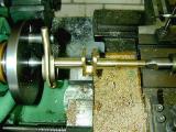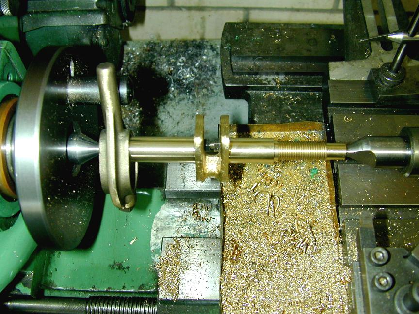 Now, finally, the tip: we have to prevent the centers from springing the casting together in the gap. This would result in a shaft that is not straight when the pressure is removed. To prevent this, we fashion a short screw-jack from a piece of 8-32 bolt cut just shorter than the gap. Nuts are screwed onto each end so that they can be unscrewed to make the thing a firm fit in the gap (the inner faces having been dressed flat with a file first). Obviously we must not over-tighten the nuts or we'll be causing the same problem we are trying to prevent! The gizmo is jiggled into somewhere close to the phantom axis of the shaft in the gap and brought to finger tight. A light tweak of the spanner makes it firm without turning it into a jack. The lathe centers can now be brought to bear and heavy cuts applied with impunity.