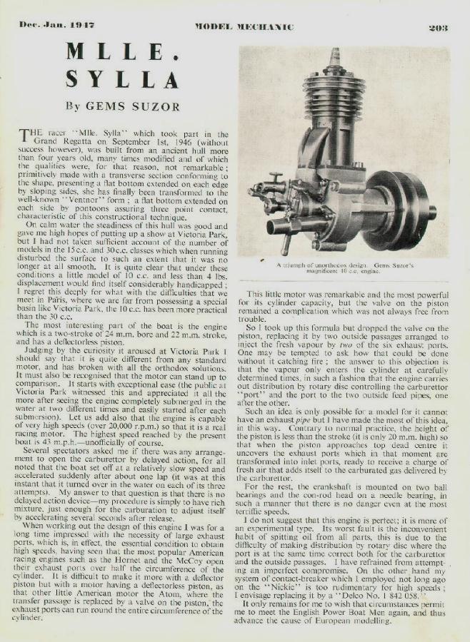 While OCR'ing the ET Westbury 2-stroke article, his reference to Gems Suzor and his remarkable transfer scheme caught my eye. I just *knew* I'd scanned an article on this engine, but do you think I could find it? Well, while cleaning up my directories of large junk files, the missing scan came to light. Here it is, "fresh" from the pages of the Model Mechanic for Dec/Jan 1947, and written by Suzor himself. No chance of fitting a muffler to this one!