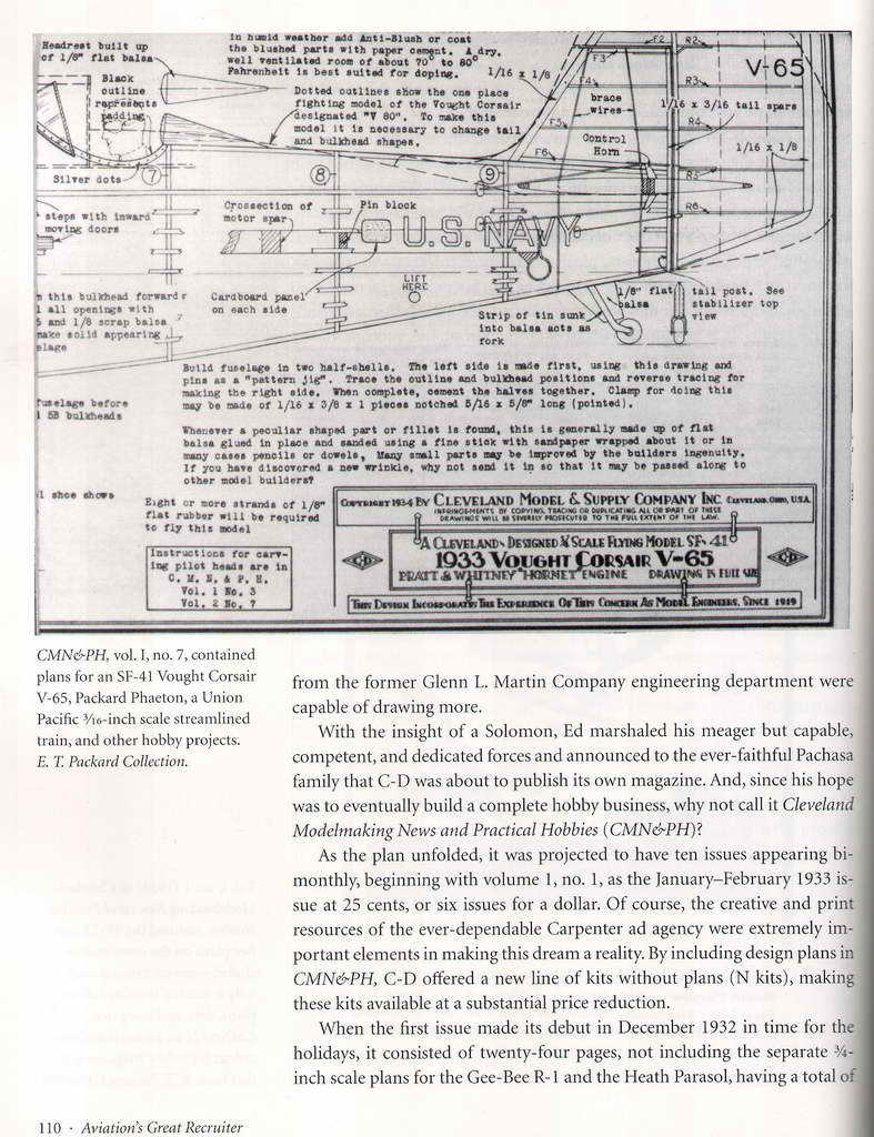 This book tells the story of Edward Thomas Packard (born ET Pachasa), his family, and the institution he founded and ran: Cleveland Model & Supply Company. In 17 chapters with five Appendices, plus References, author "Herm" Schreiner traces the blossoming, flourishing and final decline of "air-mindedness" through the impact it had on Pachasa, and conversely, the contribution he made to it. It's apparent that Schreiner is far from un-biased in his appraisal. He is a model maker who first met with Ed Packard in 1971 and corresponded with him until his death in 1992. In 1989 he spent three days taping interviews with Packard and touring the Lorain Ave facility. The book contains many direct quotes from Packard, supported by corresponding high-quality photographs from several collections and partial C-D plan illustrations. As a good history should, the narrative is placed in context by describing the socio-economic forces in play at the time of the events described; from launching and growing a company during the Depression era, through the Second World War, the "instant gratification" TV generation(s), up to the Volunteer Model Engineers of modern times who have kept the designs alive (you can still buy any of the plans—see the Links Page).