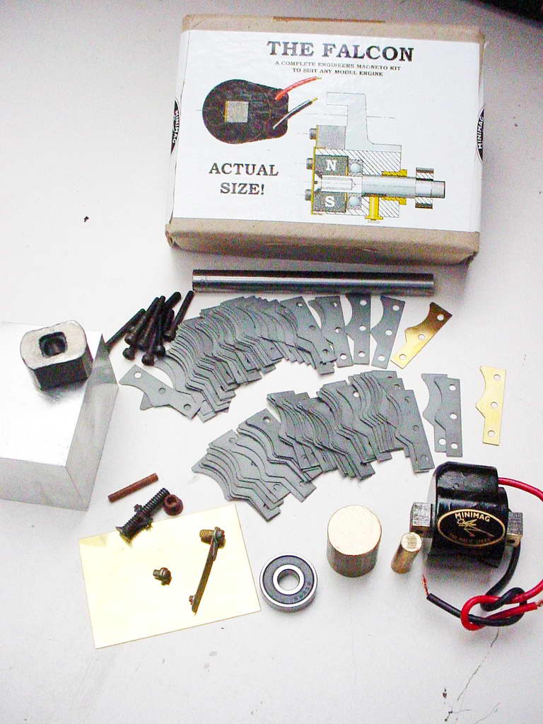 A question on the availability of miniature magnetos suitable for single and multi-cylinder ignition engines popped up on an email list recently. Readers may recall the book review from the August 2005 issue of MEN on Jim Shelly's Maltese Falcon. The magneto on that engine is called the Minimag and was developed by Jim. It is quite capable of driving anything from a simple single to a 9 cylinder radial (with appropriate gearing). Complete kits for the Minimag, as seen here, are available from Jim for about £58 (at the time this was written, naturally). Jim is not an Internet user, so you'll need to write or telephone him at: