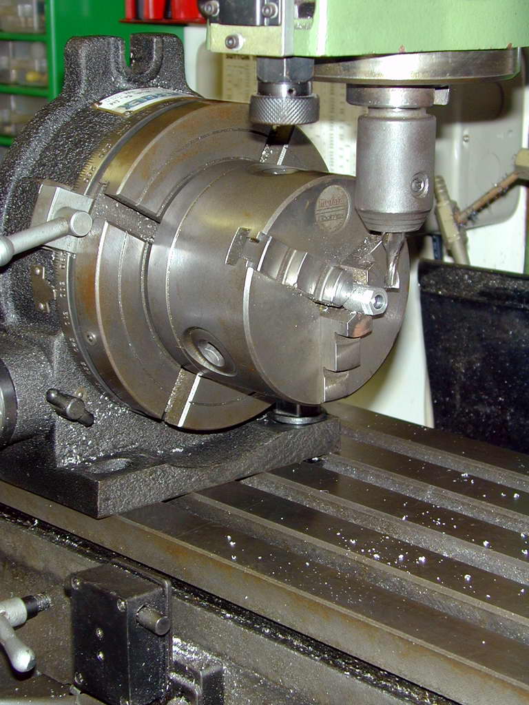 First, some magic numbers. We want to convert a piece of bar stock into hex stock. This will be done by milling off six slices, rotating the work 60° between cuts. The across-flat (AF) size will be 0.866 times the round stock diameter. Said another way, the depth for each cut will be 0.067 times the stock diameter. If you are after a precise AF hex size, you could turn the material to be hexed to 1.155 times the AF size required before you start, or just calculate the depth of cut as (D - AF)/2. Now all we need is a way to hold and index the bar.