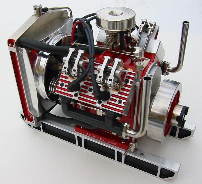 Now isn't that just the prettiest little thing you ever saw? It's a 90° V4 four-stroke designed by Jerry Howell and features on his Model Project Plans and Kits website. The displacement is 32cc and it's a barstock engine featuring "blade and fork" conrods. This allows the cylinders to sit side by side (ie, no stagger). Not so obvious is the full pressure fed lubrication system and magnetically coupled water pump. The outstanding use of color and polished machining really sets off the finish. The exposed rockers add to the crowd appeal too. Plans and construction notes are US$63.00 from Jerry (full contact details on the Suppliers Page). Go to Jerry's web site where you'll find a stack more photos and details. Incidentally, Joe Martin and the team at the Craftsmanship Museum are narrowing down the choices for their next project and this one is starting to look very good to all concerned.