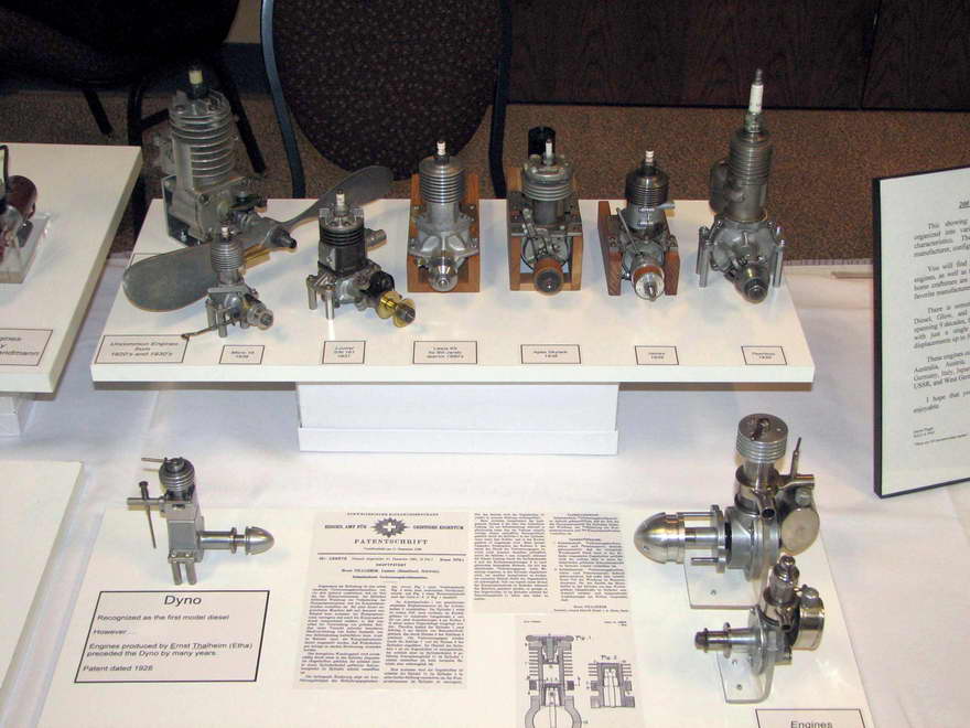 Absolutely... Can't ever get enough of that ether, but in this case I'm making oblique reference to the first model compression ignition engines mentioned here last month (go re-read it now, I'll wait...) Did you click on the link for the original Thalheim patent? Last month we only had the first page, but now, thanks to Darrel Peugh, we have a pdf of the full document. The picture shows Darrel's display from the 2007 MECA Expo with the Ethas, a Dyno, and some other fine examples from the dawn of model engines—how many can you name?
