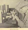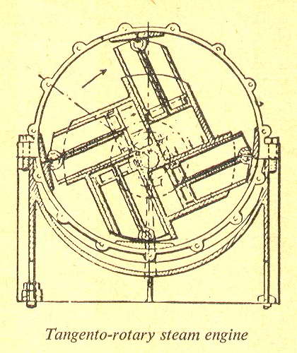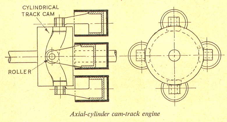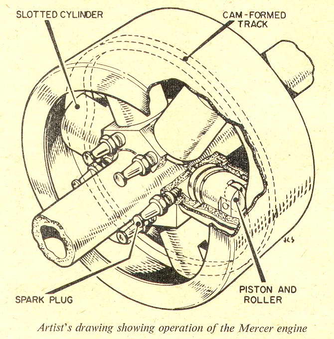 The substitute for the normal crank has usually been a swashplate or equivalent device, which produces an axial or arcuate motion of the pistons. Alternatively, there have been a few examples of engines in which the pistons, or extensions thereof, bear directly or indirectly on formed cam tracks which control their order of movement. This is sometimes done to vary the travel or duration of individual strokes to obtain, theoretically at least, an increase of efficiency. In other cases, multi-lobed cam tracks are used to increase the number of cycles per revolution of the shaft. One such engine employed a wave track on a cylindrical cam which produced eight inward and outward strokes of each piston per revolution--equivalent to using a reduction gear of 8 : 1 ratio. Generally, such engines have failed to show any improvement over those with conventional cranks and connecting rods-rather the reverse, in fact, because of the lower mechanical efficiency in transmitting motion through cams. Thrust loadsEven when ban or roller races are used as the thrust members, both the axial and side thrusts are difficult to cope with: and so far as i.c. engines are concerned, they have never attained practical success. At one time, cam-track engines operating on air pressure were popular for portable tools, where compactness was more important than economy, but they have now been superseded by rotary motors of the vane type, Which have no reciprocating parts and no valve gear. Axial piston motion, though usually favoured in cam-track engines, is not an essential feature; some engines have had peripheral cams producing a radial movement of one or' more pistons. They are less compact than the axial type, and if the cams are made to control piston movement in both directions, their construction is also more complicated. Complication is often necessary for Lc. engines, though not for single-acting steam or air motors. Both axial and radial cam-track engines have been made in "static" and "rotary" types; the latter term, as explained in previous articles, is somewhat ambiguous, though in engines with reciprocating pistons, it means that the engine structure rotates, while the crank or camshaft remains stationary. As Einstein told us, it is all a matter of relativity. But it introduces centrifugal force, which can be usefully employed in certain cases, though it is not always an unqualified advantage and may have undesirable effects. An interesting steam engine produced some years ago employed four pistons tangentially located in a rotating member, the centre of which formed a bearing for a hollow stationary shaft. This served as a steam supply pipe, and was ported to form a rotary admission valve. The rotating member was eccentrically mounted inside a circular casing, the inner surface of which formed a track on which articulated slippers attached to the pistons took their bearing, under the influence of centrifugal force. Rotation of the member caused the pistons to move inward and outward once per revolution, their stroke being determined by the eccentricity of the casing. Exhaust could be controlled either by ports and passages in the rotary valve, or by uniflow ports uncovered by the pistons. It is probable that the mechanical efficiency of this "tangento-rotary" engine was low, because of the friction of the piston slippers. Undoubtedly rollers would have been better in this case. One of the most promising cam-track engines-potentially at least was that produced in the Twenties by the Fairchild Aircraft Corporation of America. This had four radially disposed cylinders (or banks of four), the pistons of which were provided with rollers making contact with a large "figure-eight" cam, carefully designed to produce a true harmonic motion of two complete inward and outward strokes of each piston per revolution. Connecting rods between the roller pivots of the pistons tied them together, on the principle of a rhombic parallelogram, so that one opposed pair, in moving outwards, caused the other pair to move inwards, and vice versa. Side thrust eliminatedThis mechanical system imposed no side thrust on the pistons, and loading on the cam and the rollers was relatively light if the contour of the former was properly designed. The engine could be made either static or rotary, with no basic alteration in design. Presumably it did not work out as expected, though it is difficult to understand why; at any rate, it never went into production, so far as I know.A new cam-track engine brought to my notice a few weeks ago embodies some of the features already described, including the outward-mouthed cylinders and rotary valve of the "tangento-rotary" steam engine, and the "figure-eight" cam of the Fairchild-Caminez engine; though the latter surrounds the rotating system, and is internally contoured. The new engine, for want of a better term, described as an " inside-out rotary," is the invention of Mr A. C. Mercer, of Bradford, who has built a six-cylinder working model of 1-1/8 in. bore and stroke (111 c.c. total displacement). It works on the normal two-stroke principle, but as it cannot obtain crankcase compression, it is fed by a rotary blower, which is belt driven. In the centre of the assembly is a stationary hollow shaft. which forms the transfer passage, and has two ports diametrically opposite to control admission to the cylinder. The rotating assembly comprises a hexagonal hub, around which are equally spaced the six open-mouthed cylinders. Each piston is fitted with a roller bearing which engages with the cam track, and as the system rotates, makes two complete inward and outward strokes per revolution. Contact is maintained by centrifugal force which pushes the pistons outwards so that it is not necessary to provide for positive operation both ways. At the outward end of the stroke, exhaust ports, similar to those of an ordinary two-stroke, are uncovered by the piston. A sparking plug is fitted in the side of ea