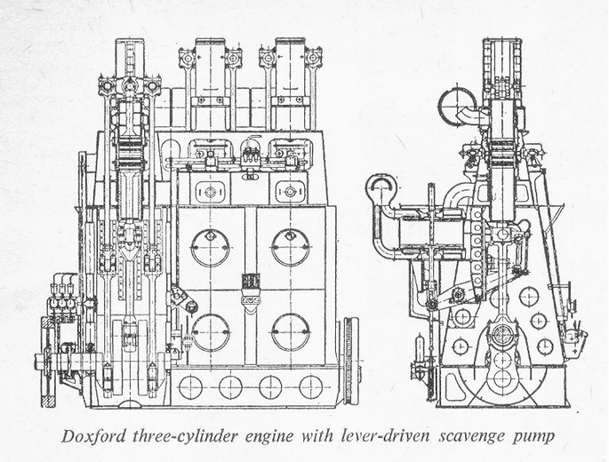 The most successful opposed-piston engines in marine practice are those produced by Fullagar and Doxford, both of which employ a cylinder and crank arrangement similar to that of the Oechelhauser, but disposed vertically instead of horizontally. This makes them tall compared to orthodox types of engines, but they take up little if any more floor space, and the extra height is not necessarily a disadvantage.