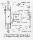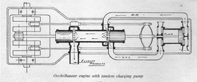 No details are shown of the fuel supply or carburetion arrangements, but these are presumed to be normal, the combustible mixture was admitted to the pump cylinder by a port which, if located as shown, must have been fitted with some form of non-return valve. By shifting this port towards the outward end of the cylinder, so that it was only uncovered by the piston at the end of its stroke, it would be possible to make this engine completely "valveless".