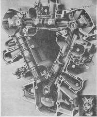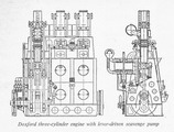 Both in marine, and locomotive practice, the Napier Deltic engine has opened up new possibilities in packing an enormous power output in this smallest possible space. This is done by arranging banks of cylinders in the form of a triangle, with crankshafts at the corners, each connected to pistons in two adjacent cylinders. The space inside the triangle is occupied by gearing, pumps and other auxiliaries.