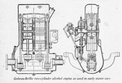 Little development of opposed piston engines had been attempted in automobile practice until recent years; the one early example of such an engine was that fitted to the Gobron Brillie car in the first decade of this century. This had a single crankshaft below the cylinders, with long connecting-rods to the upper pistons. Unlike the previous engines mentioned, it was of the four-stroke type. The only other example of a four-stroke I have been able to trace was the curious Sautter-Harle horizontal gas engine. In this, the crankshaft actually passed through a housing in the cylinder itself, and had four throws per cylinder with crossheads and yokes connecting both pistons through side connecting-rods.