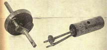 It will be noted that the upper part of the piston forms combustion chamber, and in order to enable sufficient compression to be obtained, the detachable cylinder-head is made with a spigot or "junk head," 21 in. in length, which passes down inside the piston sleeve. A tapped hole is provided in the centre of the spigot, presumably to take a sparking plug, the body of which is sunk into the spigot, so that it does not need to have an abnormally long reach. No ignition equipment was fitted to the engine at the time it came to my notice, but there was a small sprocket on the shaft, behind the flywheel, which might have been fitted, either originally or subsequently, for driving a magneto.