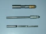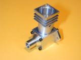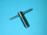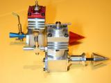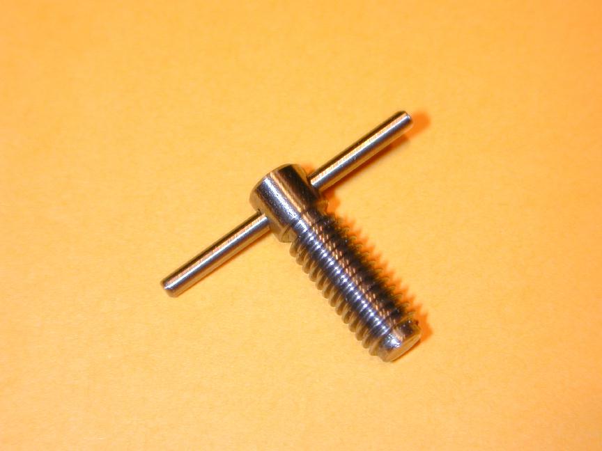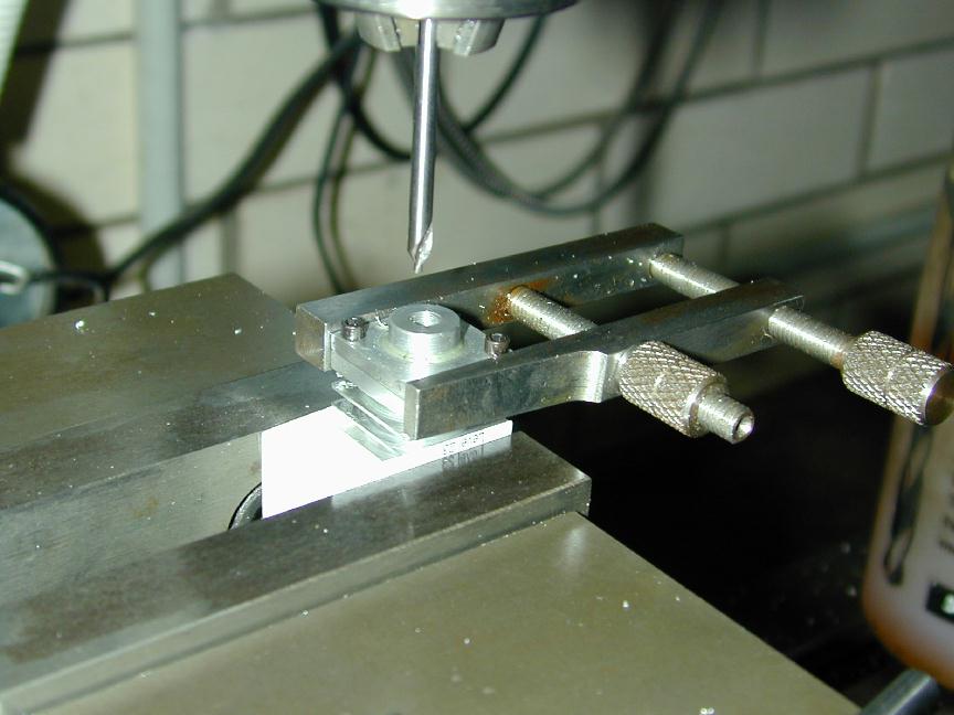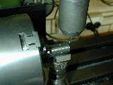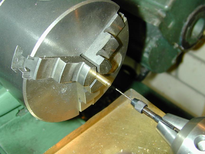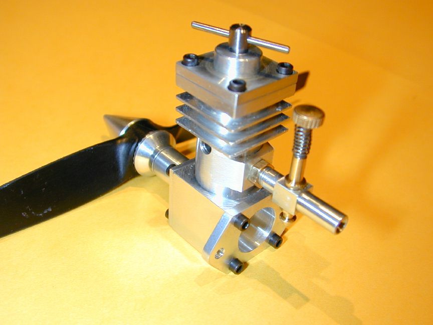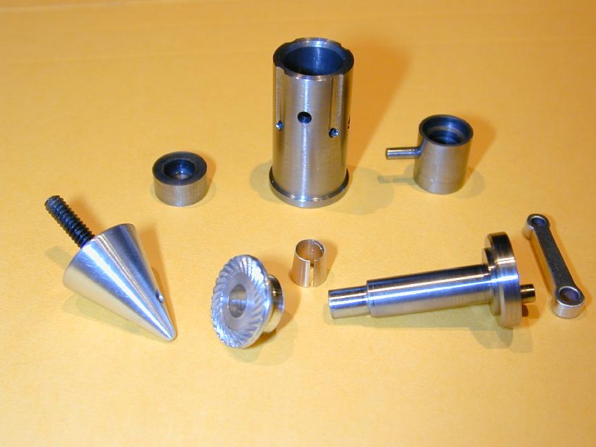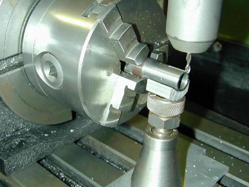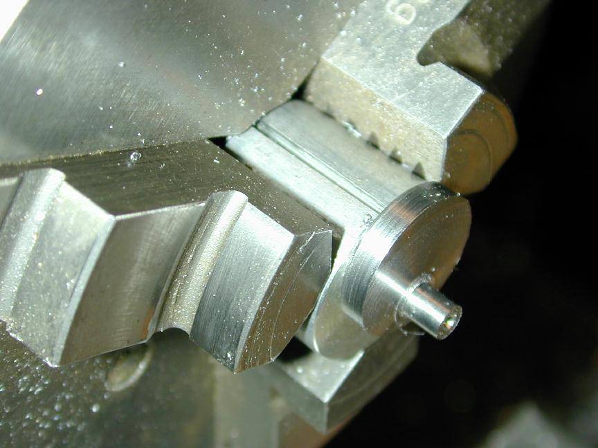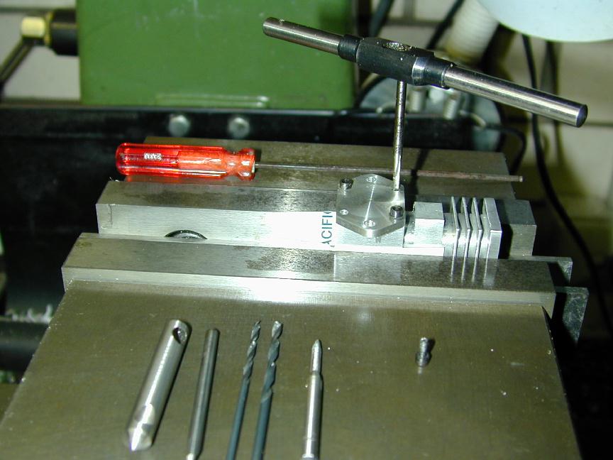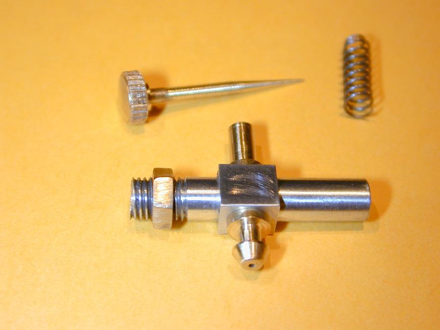The cylinder head is simple turning. The holes will be omitted until the liner is in place and they can be drilled into the crankcase in the same way as were the front/rear cover holes. The undrilled head can be seen in the back of photo #24. The venturi is simple, but tiny. I have no 1/4" aluminum plate to spare, so I turned the venturi from 5/16" diameter K&S stock, then milled the center section square, drilling and tapping 4-40 for the spray bar bits at the same setting. the 4-40 (6BA) size was chosen because the tap drill size in #42, which is just smaller than the venturi ID of 3/32". The little spray bar parts are simple, but require some precision because of their size. Photo #21 shows the fuel jet being drilled #70 using a pin chuck held in the larger chuck. make many small cuts, completely withdrawing the drill each time, brushing the chips from the flutes and you'll have no trouble. The upper spray bar was drilled through #54 and tapped 1-72 for the needle valve. The needle was taper turned with a 16 degree included angle as shown on the plan, from a length of 0.071" K&S brass rod. This was then threaded 1-72. The top knob was turned from 3/16" brass and the needle Lok-tited into it. A little burnishing on top and it looks like it has been made from the solid! Photo #22 shows the completed assembly. The spring provides operating friction and was wound from a length of old guitar "B" string. That was the output for Sunday afternoon (I worked about the same amount of time I would spend in an evening session). At this point, only the compression screw assembly needs to be made and the head attach holes drilled and tapped. The completed parts are shown in photo #24. Day 6 (Compression screw and final assembly):