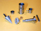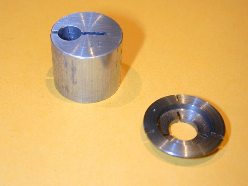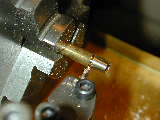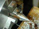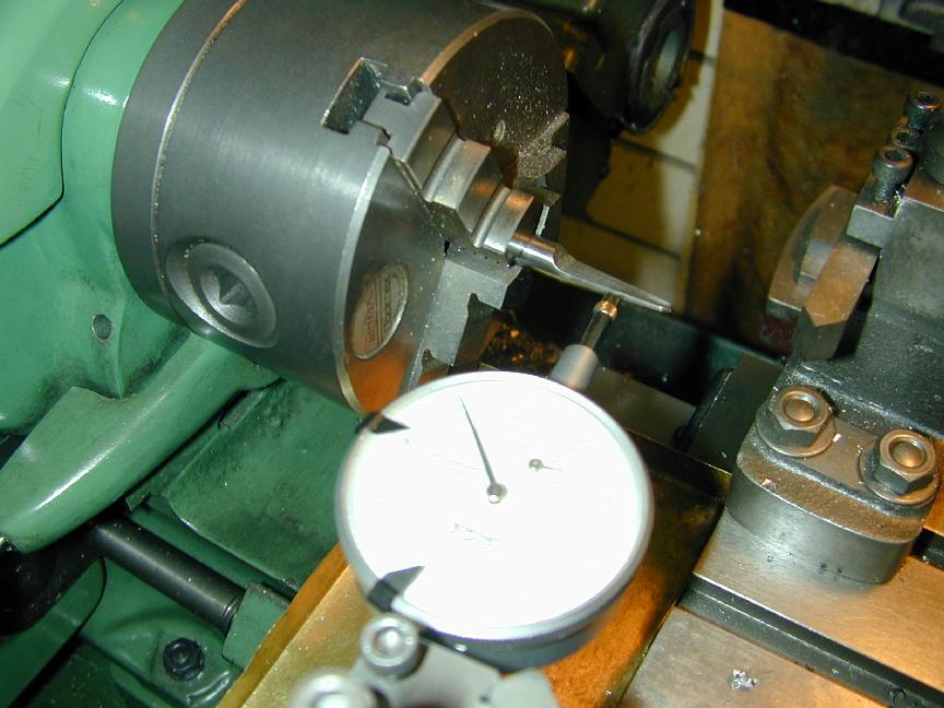 The rear cover sequence is similar although the depths in steps 1 and 2 are different because the cover is thicker. Photo #5 shows the last hole being tapped. I use a Devcon tapping fluid and don't know if this is useful, or voodoo, but I've not broken any taps lately. Day 3 (Crankshaft and prop driver):Beginner MICE express reservations about making crankshafts. They are not that bad, especially small ones, given some simple tooling. Photo #6 shows the first step in the process. This is simple parallel turning. The final 0.001" is removed with a lap. I use an adjustable one made from an English kit that is a duplicate, so I'm told, of the small Delepana external lap. Note the "1/2 center" in the tailstock that allows the tool bit to be positioned close to lathe centerline for these small jobs. The compound slide is set over to clear the tailstock and provide a finer cross feed, if needed. I use 14 degrees which gives about a 4:1 reduction on the compound dial reading. The crankpin is turned in a special jig which is nothing more than a short length of aluminum bar, drilled and reamed off center in the 4 jaw chuck by half the crank throw, then split as seen in photo #14. Take light cuts of 10 thou, from the outside down to crankpin dia, plus 20 thou. Finally, reduce the pin to size and lap for smooth fit in the conrod (or a reamed hole in a test piece). A dead center in the rear of the pin would provide additional insurance against the crank shifting in the jig (interrupted cuts are rough on set-ups), but for something this size, I didn't bother. I've departed from the original design in the prop driver area using a split cone to retain the prop driver. Long ago, I made some "D" bit taper reamers in various tapers. Photo #8 shows a reamer being used to setover the cross slide to match its taper using a plunger style DTI. In photo #9, a length of brass has been drilled 3/16" then taper turned to match the reamer taper. The small cone is next split using the trusty Dremal cut-off wheel (photo #10). The prop driver poses a small work holding problem. The knurling should be done first as this is a violent procedure, benefiting from having the rod stock firmly held in the 3 jaw chuck. The driver blank is then parted off and held in a special fixture so the rear position can be shaped and the hole drilled and reamed to match the split cone. The holding fixture idea came from SIC, where it was called a "pot-chuck". It is more clearly visible in photo 14. In photo 11, the driver has been shaped, drilled and is being reamed. Trial fit using the shaft/housing/cone assembly in the developing tapered hole. If anything, aim for too little end-play in the assembled parts. You can always pop the driver back in the pot-chuck to face back the driver for correct shaft end-play, but you can't expect it to line up well enough to ream it out more. The conical spinner is shown being finished in photo #12. It has been faced (rear), drilled, tapped and cross drilled before being threaded onto a stud in a scrap jig for taper turning. The included angle is 20 degrees. I think this shape harmonizes well with the taper on the front bearing housing and the prop driver. All the finished parts are shown in photo #13. The stud is a sawn of 6-32 Allen head cap screw (using that trusty Dremel tool, again). Day 4 (Cylinder, Piston, and Rod Assy):