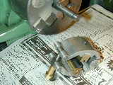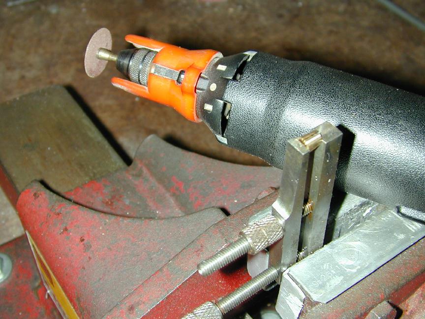 The cylinder lapping process is another deep mystery to new engine builders that is really simple. Photo #19 shows two styles of laps. The one on top was used to lap the EZE-1 cylinder. The lower one was originally made to lap the cylinder of my first home made engine - a Sparey 0.8cc (sic). I reused its mandrel, with a different lap, for the EZE-3. It's a long, tapered mandrel onto which fits an aluminum (or brass, or cast iron) plug of diameter a shade under the un-lapped bore. This is split lengthwise with a hacksaw and carries two sawed grooves at 120 degrees to the split. These act as combination oil damns, chip collecting drains and expansion assistors. A small piano wire pin in the mandrel engages in the groove, preventing the lap from twisting on the mandrel. A screw and coller on the end push the lap up the mandrel where the taper causes it to expand. The taper reamer at the bottom is made from drill rod, hardened and tempered. It is used to ream the lap to match the mandrel before splitting. The lap is "charged" with diamond lapping paste (fine grade) by squeezing the merest dab onto some fully hardened tool steel, then rolling the lap around on it, embedding the grit into the surface. In use, the lap is spun at around 200 rpm and the cylinder stroked up and down it with lots of fine grade oil. The aim to smooth out the bore and introduce a small taper (no more than 0.001" for this engine), uniformly, from bottom to top so the piston goes tight towards TDC. This is done by feel and is a skill easily acquired. Now call me Scottish, Jewish, or just plain mean, but I have a problem with taking a piece of SG cast iron rod, 1-3/4" in diameter (the smallest I can buy), that is hard to locate and costs a fortune, then reducing it to less than one half and inch in diameter to make the piston! A while back I hit on this Uncle Scrooge solution. Saw off a piece of rod, then saw that radialy into three 120 degree segments. Each one will make a piston up to 0.5" diameter. The shape grips well in the 3 jaw chuck and apart from the interrupted cut while you're banging the corners off (use a roughing tool, not your finishing tool), the method is quick and painless. Photo #17 shows such a lump being turned to circular for the piston and contra piston. After turning to within 0.001" of the bore measured at the TOP of the liner, drill out the blank for the piston interior, then over to the rotary table on the mill for gudgeon pin drilling and remering. Back to the lathe to part off, then drill and tap the contra piston interior. Part this off next and we're ready for lapping. I use holding fixtures very similar to those Tom describes in the Nov 1999 MEW to hold the piston and contra piston for lapping. Photo #17 shows the contra piston on its fixture being lapped. Note paper to protect the lathe bed and the little adjustable external lap which is worth its weight in Microsoft founder stock. The lapping process screws the part up tight on the threaded mandrel, but you just tighten up the lap on it and it acts as a soft clamp to loosen the part. It's interesting to note that the gudgeon pin diameter has been reduced from the 1/8" called out in the EZE-1 plans, to 3/32" for the EZE-3. I thought the previous size was massive overkill, but discovered during my research of the Little Dragon that it too, had a 1/8" wrist pin, but used brass tube as the material. Finally for this session, the conrod is drilled, reamed and contoured. Both holes must be done at the same setup to ensure they are parallel. This is where a mill, or a vertical slide for your lathe is a major asset. It lets you drill and ream one hole, then move precisely to the location for the next. Photo #20 shows the profiling in progress with the rod sitting on two drill rod "D" bit reamers, shimmed up so the rod sides will taper, bottom to top. Final rounding is started on a sanding table and finished with needle files and burnishing belt. If the output for this session seems very productive, it was a Saturday, so maybe it should count as two days work :) Day 5 (Cylinder head and venturi assy):