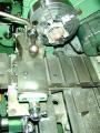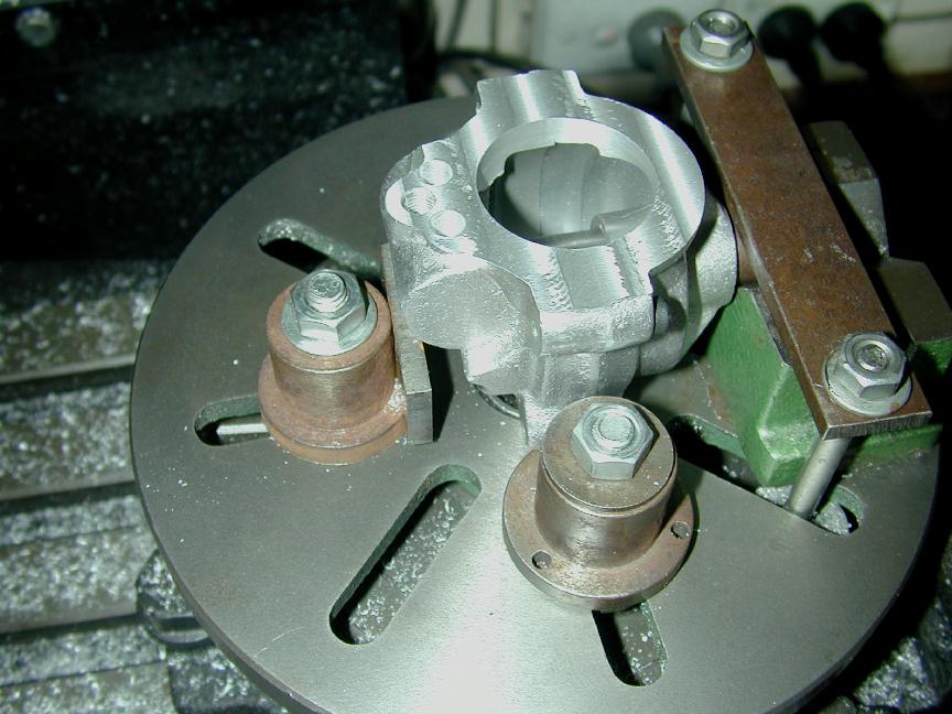 Before pulling down this setup, the case is rotated 180 degrees and the mill y axis adjusted to recenter over the camshaft axis. The casting is them faced and trepanned to provide a seat and clearence for the point assembly. At the same setting, a blind hole is drilled and tapped 4-40 for the screw that will secure a spring steel finger whose function is to hold the point assembly casting in place and apply sufficient friction for advance/retard action. One more use for this setup: rotate the case 90 degrees to bottoms-up position, and the hole for the sump drain screw plug can be drilled and tapped.