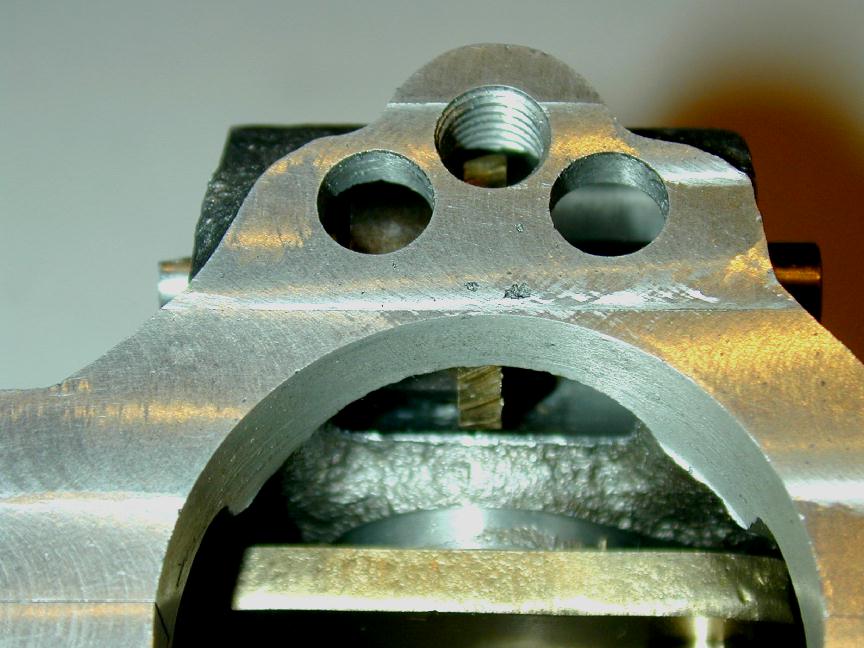 This shot shows the way the cam cavity breaks through into the main case cavity, allowing the gears, cams, and tappets to be lubricated by splash and oil mist from the wet sump. The passage also provides the connection that allows the crankcase breather tube positioned between the tappet guides to vent corrosive gasses from the case, while limiting oil loss—unless the engine is operated for any significant period at negative G's (joke). The positions are per the plan, but if I was doing over, I'd move the breather hole aft a thirty-second or so to give more spacing from the tappet guide holes.